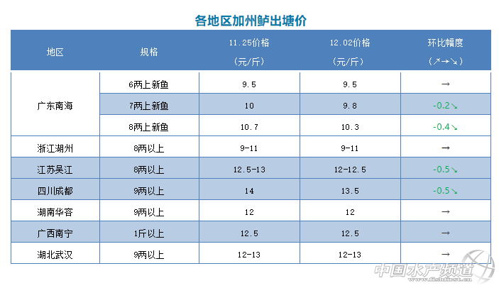 | 中國水產(chǎn)頻道原創(chuàng)報道, 文/圖 何氏水產(chǎn)、水產(chǎn)前沿 李靜 加州鱸 本周除浙江湖州、湖南華容、廣西南寧、湖北武漢價格保持穩(wěn)定外,其它產(chǎn)區(qū)都有0.2-0.5元/斤不等的跌幅。 1、本周廣東鱸魚8兩上開塘價在10.3元/斤,下跌了0.4元/斤,7兩以上價格是9.8元/斤,比上周也下跌了0.2元/斤,養(yǎng)戶很少出6兩上魚,基本是7兩抓起,開塘價不變還是9.5元/斤,F(xiàn)在鱸魚存塘量大魚頭比例越來越多了,大部分養(yǎng)戶都選擇出大規(guī)格魚為主,實際塘頭價格根據(jù)魚頭大小和規(guī)格比例來訂。目前價位相比高位時落差較大,養(yǎng)戶大多惜售,想養(yǎng)大規(guī)格提高產(chǎn)量和效益。本周出魚規(guī)格以8兩上和1斤上規(guī)格居多。 2、浙江湖州鱸魚價格持穩(wěn)為主,8兩以上價格還是9-11元/斤,具體價格要看魚頭大小和規(guī)格成數(shù)而定,當(dāng)?shù)仞B(yǎng)戶出魚積極性較高,以出統(tǒng)貨為主。江蘇吳江本周價格下跌了0.5元/斤,8兩上報價是12-12.5元/斤。由于價格未達到養(yǎng)戶心理預(yù)期,加上當(dāng)?shù)亓?xí)慣養(yǎng)老魚,大部分養(yǎng)戶惜售心理增強,目前出魚量不大,流通商多到湖州區(qū)域收魚。四川成都今天9兩上報價13.5元/斤,魚價比上周下跌了0.5元/斤,受廣東行情影響,天氣變冷后,出魚量比上周有所減少。湖北武漢、湖南華容、廣西南寧本周價格都保持穩(wěn)定,當(dāng)?shù)剡_到上市規(guī)格的魚不多,加上魚價未達預(yù)期,養(yǎng)戶賣魚積極性不高,流通商多到外省收魚。 |