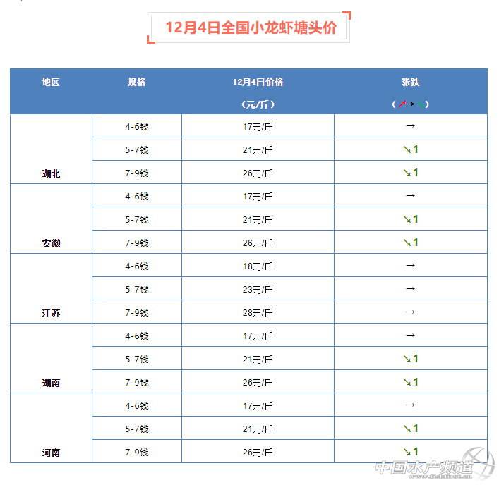 摘要: 中國水產(chǎn)頻道原創(chuàng)報道,12月4日全國小龍蝦塘頭價。