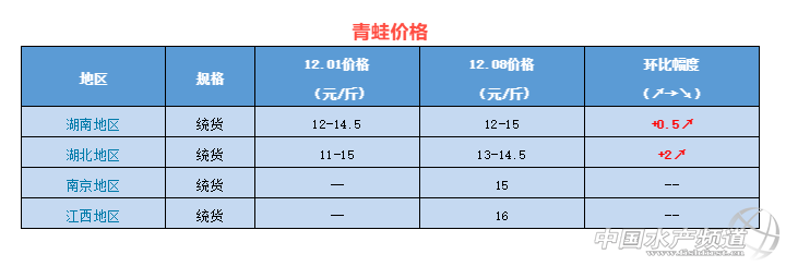 | 中國(guó)水產(chǎn)頻道原創(chuàng)報(bào)道, 本周牛蛙、泰蛙、青蛙最新行情報(bào)價(jià) 文/ 水產(chǎn)前沿 陳曉慶 一周行情簡(jiǎn)析 牛蛙 福建、廣東澄海地區(qū)蛙價(jià)從前天開(kāi)始出現(xiàn)大漲。今日澄海大蛙報(bào)價(jià)4.7元/斤,福建漳州5-9兩收4.7元/斤,相比上周上漲了0.5元/斤。福建福州5-9的大蛙今日現(xiàn)金4.1元/斤,欠帳4.5元/斤,相比上周上漲了0.4元/斤。江西南昌4-8兩的蛙報(bào)價(jià)4.5元/斤。廣東佛山、廣西南寧8兩頭牛蛙價(jià)格4-4.2元/斤,海南文昌8兩頭3.8-4元/斤,價(jià)格穩(wěn)定,與上周持平。 隨著近期氣溫的大幅度下降,蛙價(jià)開(kāi)始出現(xiàn)上漲的趨勢(shì)。廣東澄海目前的牛蛙存塘量較大,但還沒(méi)開(kāi)始大量上市,出蛙的人并不多見(jiàn),多數(shù)養(yǎng)殖戶還是選擇繼續(xù)等價(jià)。而周邊的梅州、河源和海陸豐等地經(jīng)過(guò)前段時(shí)間的消化,目前存塘量較少。 福建由于蛙源較少,蛙價(jià)從前天開(kāi)始大幅度上漲,福建漳州3-7兩的蛙開(kāi)到4.2-4.3元/斤,5-9兩最多開(kāi)到4.7元/斤。江西地區(qū)的流通商也表示目前本地收蛙比較困難。 廣西地區(qū)當(dāng)前牛蛙存量依然較多,價(jià)格平穩(wěn),未能見(jiàn)到上漲的趨勢(shì)。部分地區(qū)受缺水干旱的影響,即使目前處于低價(jià),也只能忍痛出售,避免進(jìn)一步的損失。 泰國(guó)虎紋蛙 近期泰蛙價(jià)格較為穩(wěn)定,供求關(guān)系趨于平衡。泰蛙6兩頭規(guī)格廣西南寧報(bào)價(jià)4.8至5元/斤,廣東佛山4.6至4.7元/斤,海南文昌4.5-4.6元/斤,價(jià)格相比上周有所下滑。 青蛙(黑斑蛙) 隨著氣溫的持續(xù)走低,青蛙價(jià)格一路高升。目前江西地區(qū)最高賣(mài)到16元/斤,南京價(jià)格較為穩(wěn)定,湖南湖北蛙價(jià)皆有上漲。 |