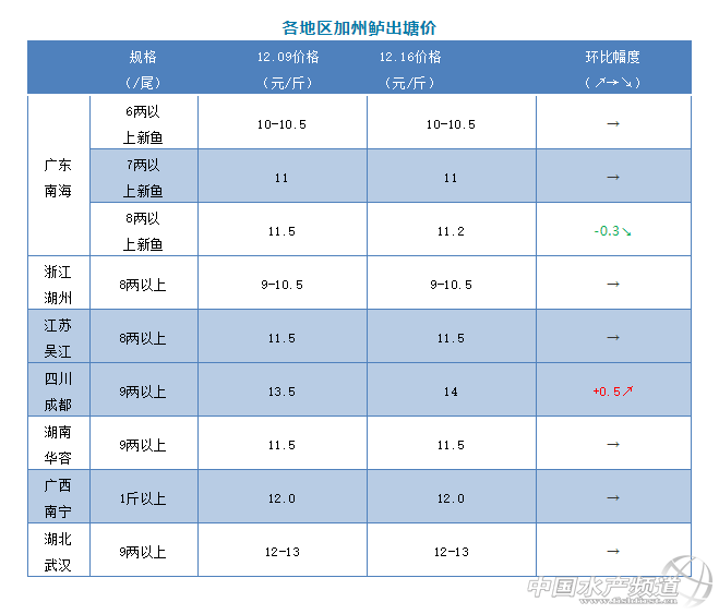 | 中國水產(chǎn)頻道原創(chuàng)報道, 文/圖 何氏水產(chǎn)、水產(chǎn)前沿 李靜 加州鱸 本周廣東佛山加州鱸魚價先漲后跌,除8兩上有0.3元/斤的跌幅,其它規(guī)格都保持穩(wěn)定,其它產(chǎn)區(qū)除四川成都有0.5元/斤的漲幅外,都保持穩(wěn)定。 1、本周廣東鱸魚8兩上開塘價在11.2元/斤,比上周下跌了0.3元/斤;7兩以上價格保持穩(wěn)定,還是11.0元/斤;6兩上價格也保持穩(wěn)定,10-10.5元/斤。9兩上11.5元/斤,最終成交價還是看魚頭以及8兩以上的比例來定價,F(xiàn)在鱸魚存塘量還是挺多,近期天氣轉(zhuǎn)冷后外省水車到廣東收魚增多,但養(yǎng)殖并不著急出魚,不少人對于元旦和春節(jié)的價格抱有希望,等價心態(tài)比較重。市場銷量也有所減少,預(yù)測短時間內(nèi)價格不會有明顯的提升。 2、本周浙江湖州價格保持穩(wěn)定,統(tǒng)貨報價9-10.5元/斤左右,具體價格要看魚頭大小和規(guī)格成而定,湖州本地養(yǎng)戶出魚積極性較高,以出統(tǒng)貨清塘為主。江蘇吳江價格一周持穩(wěn),8兩上報價11.5元/斤左右,目前魚價未達到養(yǎng)戶心理預(yù)期,本地養(yǎng)戶出魚積極性不高,出魚量很少。四川成都9兩上報價14元/斤,比上周上漲了0.5元/斤,近期天氣轉(zhuǎn)冷,養(yǎng)戶出魚積極性相比之前有所下降,出魚以大規(guī)格魚居多,以提高產(chǎn)量和效益。湖北武漢本周保持穩(wěn)定,9兩上報價12-13元/斤,本地達上市規(guī)格的魚不多,加上魚價未達養(yǎng)戶預(yù)期,出魚量不大。湖南華容魚價一周持穩(wěn),9兩上報價11.5元/斤,當(dāng)?shù)剡_上市規(guī)格的存魚不多,養(yǎng)戶出魚積極性不高,當(dāng)?shù)佤~中多到周邊區(qū)域收魚。廣西南寧1斤上報價12.0元/斤,魚價保持穩(wěn)定,當(dāng)?shù)仞B(yǎng)戶出魚積極性較高,但總體走量不大。 |