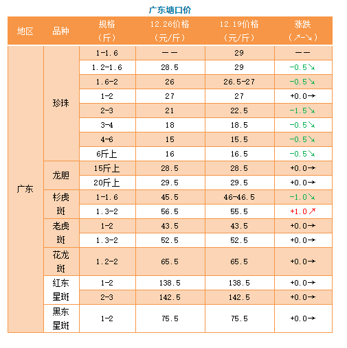 中國水產頻道原創(chuàng)報道, 12月26日海南、廣東、福建、北京石斑魚價格播報 文/水產前沿吳佳輝 行情簡析 海南:這段時間,石斑魚價格持續(xù)低迷,傳統(tǒng)節(jié)假日即將到來,是否有漲價的希望?業(yè)內人士表示:由于存塘量還比較大,漲價的希望不高。 成品魚價格 石斑魚苗價格 石斑魚苗:本周海南幾乎沒有小苗,中苗價格也相差無幾。龍膽苗價格則較亂,所以本次周報不做報價。 特別感謝:海南晨海水產有限公司、海南大順發(fā)水產有限公司、萊州明波水產有限公司、廣東上上生物科技有限公司、廣東大順發(fā)水產有限公司、福建藝祺水產養(yǎng)殖有限公司、涌益水產專業(yè)合作社為本文提供價格! 【關鍵字】:石斑魚 價格行情 水產養(yǎng)殖 |