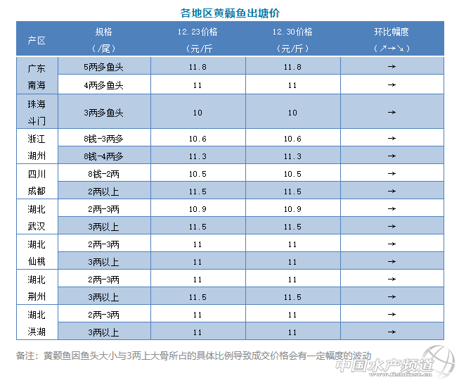 | 中國水產(chǎn)頻道原創(chuàng)報(bào)道, 文/圖 何氏水產(chǎn)、水產(chǎn)前沿 李靜 黃顙魚 1、本周廣東黃顙魚價(jià)格保持穩(wěn)定,3兩魚多頭報(bào)價(jià)10元/斤,4兩多魚頭價(jià)格是11元/斤,5.0兩魚頭11.8元/斤,目前黃顙魚存塘大規(guī)格魚越來越少,市場(chǎng)走量也不大,魚價(jià)以持穩(wěn)為主。 2、浙江湖州黃顙魚本周價(jià)格也保持穩(wěn)定,3兩多魚頭報(bào)價(jià)10.6元/斤,4兩多魚頭報(bào)價(jià)11.3元/斤。預(yù)計(jì)接下來價(jià)格變化不大,銷量跟上周差不多。 3、本周四川成都價(jià)格本周保持穩(wěn)定,本地魚達(dá)上市規(guī)格的魚較少,流通商多到湖南等地拉魚。 4、本周湖北各地區(qū)黃顙魚價(jià)格都保持穩(wěn)定,銷量跟上周也差不多。 |