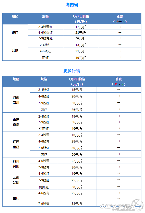 摘要: 中國(guó)水產(chǎn)頻道報(bào)道,1月2日全國(guó)小龍蝦市場(chǎng)批發(fā)價(jià)。