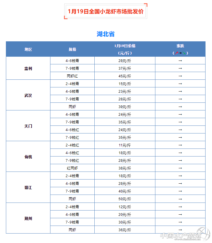 1月19日全國小龍蝦市場批發(fā)價(jià)