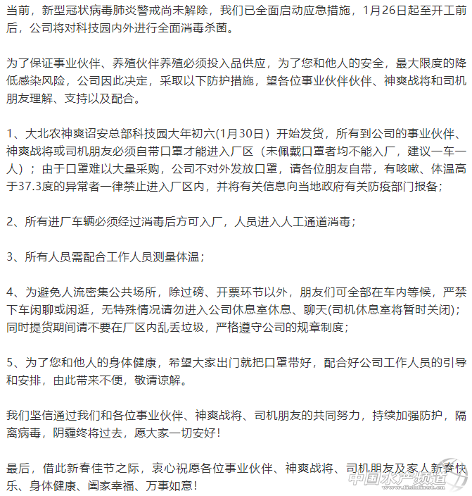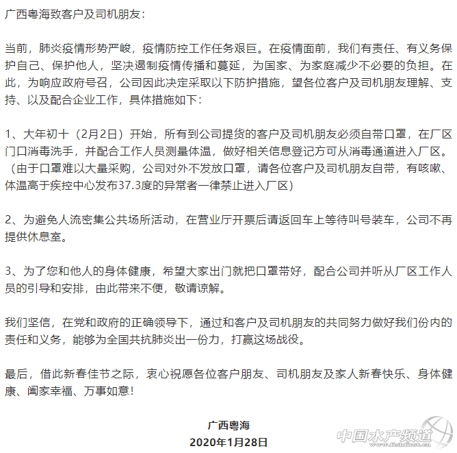 | 中國水產(chǎn)頻道綜合報道, 面對新型冠狀病毒肺炎,作為水產(chǎn)人,我們要多宣傳吃海鮮、水產(chǎn)是營養(yǎng)和安全的,要多吃,多支持和轉(zhuǎn)起! 作為公眾市民,我們要相信政府所公布信息的權(quán)威性,不要輕易相信未經(jīng)核實的信息,更不要以訛傳訛。按照防疫專家的提醒,人們在公共場所都要佩戴口罩,回到家里要認真洗手,這些最基本的防護措施必不可少,人身安全是第一。 新一年的生產(chǎn)養(yǎng)殖季即將拉開帷幕之際,作為水產(chǎn)料企,他們負責(zé)任、有義務(wù)地這樣做了——及時向各位合作商、客戶和司機朋友發(fā)出了一封信。 珠海海龍生物科技有限公司 江門海大飼料有限公司 荊州海大飼料有限公司 揭陽海大飼料有限公司 湛江海大/容大飼料有限公司 廣東通威飼料有限公司 珠海海為飼料有限公司 海南海壹水產(chǎn)飼料有限公司 廣州希望飼料有限公司 湛江市澳華水產(chǎn)飼料有限公司 江門市澳華水產(chǎn)飼料有限公司 江門市六和飼料有限公司 天門粵海 廣西粵海 大北農(nóng)神爽詔安總部科技園 佛山市金浦飼料實業(yè)有限公司 |