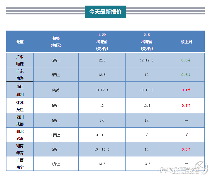 | 中國(guó)水產(chǎn)頻道原創(chuàng)報(bào)道, 多地出臺(tái)政策保障“菜籃子”,加州鱸行情后市或有轉(zhuǎn)機(jī)?! 文/圖 杰大飼料 水產(chǎn)前沿 賀志義 聯(lián)合發(fā)布 加州鱸行情走勢(shì) 一周行情綜述 受疫情持續(xù)影響,一方面是全國(guó)大部分水產(chǎn)市場(chǎng)或是菜市場(chǎng)出現(xiàn)關(guān)停,另一方面是不少地方出現(xiàn)了封城、封村、封路,加上部分餐飲業(yè)、酒店等停業(yè),導(dǎo)致加州鱸出塘、運(yùn)輸、銷售等環(huán)節(jié)都受到較大影響。市場(chǎng)消費(fèi)需求降低,各地養(yǎng)殖戶的出魚(yú)出現(xiàn)了不同程度的困難,基本上處于有價(jià)無(wú)市的狀態(tài)。廣東佛山加州鱸價(jià)格稍有回落,浙江、江蘇、湖南三地魚(yú)價(jià)略有上漲。由于疫情的影響,現(xiàn)在各地加州鱸的市場(chǎng)狀態(tài)或?qū)⒊掷m(xù),疫情結(jié)束后可能出現(xiàn)集中出魚(yú),建議各位養(yǎng)戶朋友做好規(guī)劃。 主產(chǎn)區(qū)行情簡(jiǎn)析、報(bào)價(jià) 廣東順徳:今天報(bào)價(jià)8兩上12-12.5元/斤左右,前兩天個(gè)別塘可以賣到12.5元/斤,實(shí)際價(jià)錢會(huì)有所浮動(dòng),因?yàn)橐咔樵,春?jié)假期延長(zhǎng),人員流動(dòng)少,消費(fèi)低迷,需求量減少明顯。春節(jié)之前已經(jīng)出魚(yú)和清塘的養(yǎng)殖戶比較多,所以他們目前并不著急出魚(yú)。真正受影響的個(gè)別魚(yú)塘原本就安排在春節(jié)期間出魚(yú),出魚(yú)受阻導(dǎo)致計(jì)劃就需要往后推遲。 廣東南海:今天報(bào)價(jià)8兩上12元/斤左右,實(shí)際價(jià)錢根據(jù)上車規(guī)格而定。本地依然受疫情影響比較大,以珠三角市場(chǎng)魚(yú)車為主,但收魚(yú)量很少,個(gè)別村已經(jīng)連續(xù)幾天沒(méi)有養(yǎng)殖戶出魚(yú),出魚(yú)積極性也比較低,因?yàn)槭蒸~(yú)量太少,出魚(yú)成本會(huì)增大。現(xiàn)在出魚(yú)的魚(yú)塘,一天大多只收1-2萬(wàn)斤魚(yú)不等,以本地市場(chǎng)車為主,外省魚(yú)車少。 浙江湖州:湖州今天統(tǒng)貨(7成8兩上)12.5元/斤,8兩上的14元/斤,上漲0.5元/斤,但是走貨量下降較多。受疫情影響,湖州市南潯區(qū)已經(jīng)只出不 |