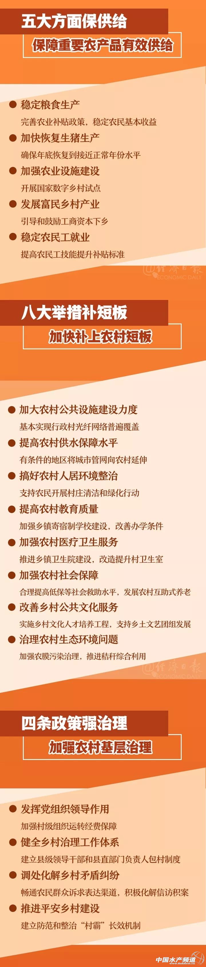 | 中國(guó)水產(chǎn)頻道報(bào)道, 21世紀(jì)以來(lái)第17個(gè)指導(dǎo)“三農(nóng)”工作的中央一號(hào)文件5日由新華社受權(quán)發(fā)布 這份文件題為《中共中央國(guó)務(wù)院關(guān)于抓好“三農(nóng)”領(lǐng)域重點(diǎn)工作確保如期實(shí)現(xiàn)全面小康的意見(jiàn)》,全文共5個(gè)部分,包括:堅(jiān)決打贏脫貧攻堅(jiān)戰(zhàn);對(duì)標(biāo)全面建成小康社會(huì)加快補(bǔ)上農(nóng)村基礎(chǔ)設(shè)施和公共服務(wù)短板;保障重要農(nóng)產(chǎn)品有效供給和促進(jìn)農(nóng)民持續(xù)增收;加強(qiáng)農(nóng)村基層治理;強(qiáng)化農(nóng)村補(bǔ)短板保障措施。 文件指出,2020年是全面建成小康社會(huì)目標(biāo)實(shí)現(xiàn)之年,是全面打贏脫貧攻堅(jiān)戰(zhàn)收官之年。黨中央認(rèn)為,完成上述兩大目標(biāo)任務(wù),脫貧攻堅(jiān)最后堡壘必須攻克,全面小康“三農(nóng)”領(lǐng)域突出短板必須補(bǔ)上。 文件確定,對(duì)標(biāo)對(duì)表全面建成小康社會(huì)目標(biāo),強(qiáng)化舉措、狠抓落實(shí),集中力量完成打贏脫貧攻堅(jiān)戰(zhàn)和補(bǔ)上全面小康“三農(nóng)”領(lǐng)域突出短板兩大重點(diǎn)任務(wù),持續(xù)抓好農(nóng)業(yè)穩(wěn)產(chǎn)保供和農(nóng)民增收,推進(jìn)農(nóng)業(yè)高質(zhì)量發(fā)展,保持農(nóng)村社會(huì)和諧穩(wěn)定,提升農(nóng)民群眾獲得感、幸福感、安全感,確保脫貧攻堅(jiān)戰(zhàn)圓滿收官,確保農(nóng)村同步全面建成小康社會(huì)。 中央農(nóng)村工作領(lǐng)導(dǎo)小組辦公室有關(guān)負(fù)責(zé)人表示,完成這兩大目標(biāo)任務(wù),脫貧攻堅(jiān)還有一些最后的堡壘必須攻克,全面小康“三農(nóng)”領(lǐng)域還有一些突出短板必須補(bǔ)上。面對(duì)國(guó)內(nèi)外風(fēng)險(xiǎn)挑戰(zhàn)明顯上升、經(jīng)濟(jì)下行壓力加大的復(fù)雜局面,穩(wěn)住農(nóng)業(yè)基本盤、發(fā)揮“三農(nóng)”壓艙石作用至關(guān)重要,政策措施必須逐項(xiàng)抓好落實(shí),確保如期完成任務(wù)。(本文轉(zhuǎn)自【新華社】。如有版權(quán)問(wèn)題,敬請(qǐng)聯(lián)系wx@fishfirst.cn。) |