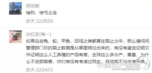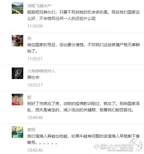 | 中國水產(chǎn)頻道報道, 急急急!鱷魚、龜、水魚、牛蛙、泥鰍、蟮、鴨嘴魚、鱘龍魚、娃娃魚等成了野生動物被禁止銷售食用?這對水產(chǎn)人來說,將是極其嚴厲的沉重打擊! 國家10部委聯(lián)合打擊野生動物違規(guī)交易 2月3日,10部委(局)聯(lián)合部署打擊野生動物違規(guī)交易專項執(zhí)法行動。各地積極行動起來,嚴查違法出售、購買、利用、運輸、攜帶、寄遞野生動物及其制品的行為以及相關的廣告。 面對疫情,專家提醒,公眾要堅決拒吃野味,注意個人衛(wèi)生。 嚴禁任何形式的野生動物交易 記者2月3日從國家市場監(jiān)管總局獲悉:市場監(jiān)管總局日前聯(lián)合中央網(wǎng)信辦、生態(tài)環(huán)境部、農(nóng)業(yè)農(nóng)村部、公安部、商務部、衛(wèi)生健康委、海關總署、林草局、藥監(jiān)局等部委(局)召開打擊野生動物違規(guī)交易專項執(zhí)法行動和打擊非法制售口罩等防護產(chǎn)品專項執(zhí)法行動(以下簡稱“聯(lián)合雙打行動”)部署會議。 會議強調,疫情期間嚴禁任何形式的野生動物交易活動。嚴查違法出售、購買、利用、運輸、攜帶、寄遞野生動物及其制品的行為;不得為出售、購買野生動物及其制品發(fā)布廣告及提供交易服務等。 “病毒在變化、適應人類,科學認識病毒會有一個過程!眹倚l(wèi)健委高級別專家組成員、中科院院士、中國疾控中心主任高福介紹,這次發(fā)現(xiàn)的新型冠狀病毒是第七個感染人類的冠狀病毒,“我們通過一些非常手段,已經(jīng)找到證據(jù)。我們在懷疑有野生動物銷售的環(huán)境中,檢測到有這種病毒,傳染源還不明確,找不到具體是哪個動物,還在不斷認識過程中。” 廣東省12部門聯(lián)合打擊野生動物違規(guī)交易 廣東省市場監(jiān)管局4日通報,該部門正聯(lián)合省委網(wǎng)信辦、生態(tài)環(huán)境廳、農(nóng)業(yè)農(nóng)村廳、工業(yè)和信息化廳、公安廳、住房城鄉(xiāng)建設廳、商務廳、衛(wèi)生健康委、林業(yè)局、藥監(jiān)局以及海關總署廣東分署等共12個部門,開展“廣東省聯(lián)合打擊野生動物違規(guī)交易專項執(zhí)法行動”。 廣東要求,各地各有關部門要迅速行動,組織動員最強力量,嚴查野生動物違規(guī)交易行為,全面禁絕違規(guī)交易。 廣東要求,對違規(guī)交易野生動物的經(jīng)營者一律停業(yè)整頓,經(jīng)營場所一律查封,涉嫌犯罪的一律移送公安機關。 無論是野生的還是人工馴養(yǎng)繁殖的 一律禁絕交易! 會議指出,各地各部門要堅決貫徹落實國家領導人的重要指示批示精神,落實黨中央、國務院關于應對新型冠狀病毒感染的肺炎疫情的一系列決策部署,進一步提高政治站位,切實增強開展聯(lián)合雙打行動的政治自覺、思想自覺和行動自覺,以最嚴措施開展聯(lián)合雙打行動,從嚴從重從快查處違法違規(guī)行為。 嚴查野生動物違規(guī)交易行為 全面禁絕違規(guī)交易 各地各有關部門要迅速行動起來,按照最嚴格要求、組織動員最強力量、部署實施最有力措施。 根據(jù)《市場監(jiān)管總局農(nóng)業(yè)農(nóng)村部國家林草局關于禁止野生動物交易的公告》(2020年第4號)精神,在疫情防控的“戰(zhàn)時狀態(tài)”下,禁絕任何形式的野生動物交易活動,突出強調“七個一律禁絕交易”,即: ✍無論是野生的還是人工馴養(yǎng)繁殖的一律禁絕交易; ✍無論是陸生的還是水生的一律禁絕交易; ✍無論是農(nóng)貿(mào)市場還是農(nóng)村集(墟)市、餐飲單位一律禁絕交易; ✍無論是活體還是死體一律禁絕交易; ✍無論是市場內(nèi)還是市場外一律禁絕交易; ✍無論是野生動物制品還是其制作食品一律禁絕交易; ✍無論是否已取得野生動物經(jīng)營資質一律禁絕交易。 同時提出“三個一律”明確要求,即對違規(guī)交易野生動物的經(jīng)營者一律停業(yè)整頓,經(jīng)營場所一律查封,涉嫌犯罪的一律移送公安機關。 除了廣東12部門聯(lián)合打擊交易水魚、龜、牛蛙外,在黃沙水產(chǎn)交易市場有限公司經(jīng)營部通告,還有蛇類、鱷魚、娃娃魚同樣不能擴散、轉運和銷售,廣東部分地區(qū)還把泥鰍、鱔等品種也列入禁售交易的范疇。 牛蛙賤賣到1元/斤、市場2000萬元龜鱉面臨死亡 據(jù)悉,自從牛蛙、甲魚、烏龜被一紙文件列入野生動物或飼養(yǎng)繁育的野生動物的范疇,20萬斤青蛙封存,單單澄海就有十幾萬噸牛蛙走投無路,牛蛙價格一泄千里,賤賣到1元/斤的絕境!昨天,水產(chǎn)前沿公眾號報道了以下兩篇文章,引發(fā)了行業(yè)引起了高度的關注和反響,眾多讀者爭相留言表達了對事件看法! 《人工養(yǎng)殖30年龜鱉一夜間變成野味?禁售、落封條,黃沙市場2千萬元龜鱉正在等死》 《20萬只青蛙被封!禁運禁售,十幾萬噸牛蛙無路可走!業(yè)界呼吁:分類管理不可一刀切》 部分網(wǎng)友留言 還有很多很多...... 震驚!泥鰍、蟮、鴨嘴魚、鱘龍魚都成了野生動物? 據(jù)悉,目前廣州黃沙水產(chǎn)市場發(fā)文嚴禁交易野生動物及其制品,包括人工飼養(yǎng)的野生動物,主要包括人工養(yǎng)殖的蛇類、鱷魚、娃娃魚、水魚、龜?shù)。但在廣東很多地區(qū),日前也紛紛發(fā)文一律停止銷售包括鱷魚、龜、蛇、旱獺、竹鼠、野豬、黃猄、獾、果子貍、水魚、牛蛙、泥鰍、蝎子、蟮、石燕、鷓鴣、鴨嘴魚、鱘