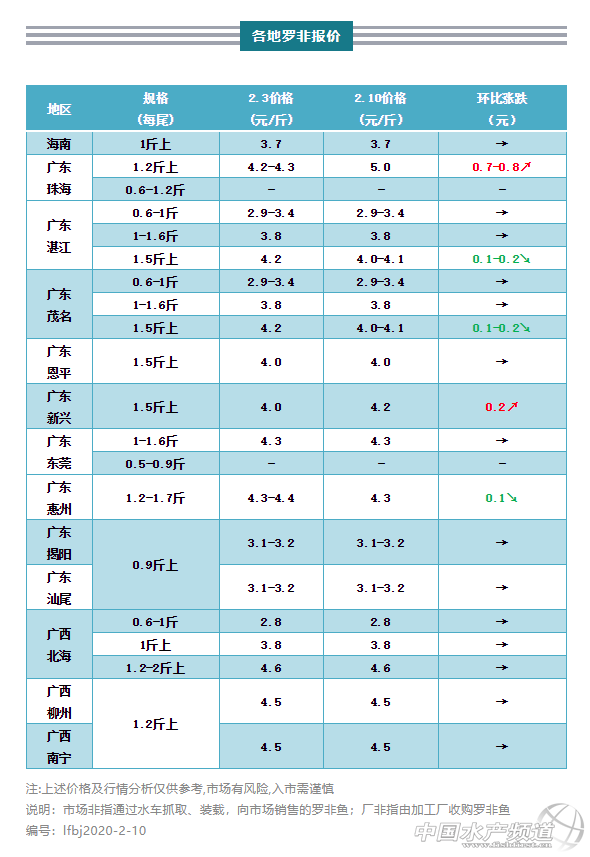 | 中國(guó)水產(chǎn)頻道原創(chuàng)報(bào)道, 現(xiàn)時(shí)養(yǎng)殖戶出魚意愿較大,只是擔(dān)心流通問(wèn)題,正在觀望 文/ 水產(chǎn)前沿 葉豐齊 水產(chǎn)前沿專業(yè)為你推送羅非魚 最新價(jià)格行情及行業(yè)新聞、各類資訊。 同時(shí)歡迎行業(yè)人士踴躍爆料,請(qǐng)掃二維碼聯(lián)系 代表產(chǎn)區(qū)羅非魚行情走勢(shì) 一周要聞 我國(guó)羅非魚產(chǎn)業(yè)比較依賴加工出口,因?yàn)橐咔榈木壒剩藛T到崗率存在問(wèn)題,現(xiàn)時(shí)許多加工企業(yè)仍未復(fù)工進(jìn)行生產(chǎn);某加工企業(yè)從業(yè)者回應(yīng)筆者,在疫情解除前,羅非魚加工品出口可能會(huì)存在一些階段性影響,但長(zhǎng)期來(lái)看影響應(yīng)不會(huì)太大,因?yàn)檫^(guò)冬的羅非魚存量相對(duì)不會(huì)太多,疫情結(jié)束后國(guó)內(nèi)市場(chǎng)能夠消化一部分,而目前供應(yīng)國(guó)內(nèi)的庫(kù)存已經(jīng)比較少了,給復(fù)工后收魚留有一定的空間。至于養(yǎng)殖方面,有養(yǎng)殖戶表示,現(xiàn)時(shí)水溫低,基本投不上料,飼料暫時(shí)不成問(wèn)題;去年年末也放足了冬苗,并不是很擔(dān)心疫情的影響;不過(guò)也有養(yǎng)殖戶提出,一旦魚塘出現(xiàn)點(diǎn)問(wèn)題,如水質(zhì)出現(xiàn)變化,受阻于鄉(xiāng)鎮(zhèn)封路與隔離措施,一時(shí)半會(huì)也沒(méi)法請(qǐng)來(lái)技術(shù)員幫忙,只能盡量多開增氧機(jī)了事;據(jù)悉,若天氣回暖,底肥有機(jī)質(zhì)發(fā)酵分解耗氧厲害,魚塘易缺氧,養(yǎng)殖戶務(wù)必注意。 整體行情綜述 各產(chǎn)區(qū)羅非魚價(jià)格基本與上周持平,部分地區(qū)小跌,珠海大漲:海南繼續(xù)保持上周行情;珠三角地區(qū),珠海1.2斤以上規(guī)格市場(chǎng)非較上周上漲0.7-0.8元/斤;恩平魚價(jià)與上周持平;新興1.5斤以上規(guī)格市場(chǎng)非較上周上調(diào)0.2元/斤;東莞魚價(jià)同上周一致;粵東地區(qū)惠州1.2-1.8斤規(guī)格市場(chǎng)非較上周下調(diào)0.1元/斤,至于揭陽(yáng)和海豐魚價(jià)依然維持;粵西地區(qū)湛江和茂名廠非與上周行情持平,1.5斤以上規(guī)格市場(chǎng)非較上周下調(diào)0.1-0.2元/斤;廣西地區(qū)北海、南寧和柳州羅非行情保持不變。 各產(chǎn)地行情分析 海南地區(qū):養(yǎng)殖戶在等待加工廠復(fù)工,本周沒(méi)有出廠非,0.6-1斤規(guī)格2.7元/斤,1斤以上規(guī)格3.7元/斤,行情皆保持不變;目前也沒(méi)有市場(chǎng)非出魚,塘頭現(xiàn)金收購(gòu)價(jià)3.5元/斤,同上周;走海南西線市場(chǎng)1斤以上規(guī)格羅非3.5元/斤,與上周行情一致;據(jù)業(yè)者估計(jì),依然約有30%的羅非存塘,而新苗投放量接近90%,后市行情以及今年整體形勢(shì)仍有待觀望。 珠三角地區(qū):珠海存塘大約200萬(wàn)斤羅非魚,包括平均5.5斤的大規(guī)格羅非(約8.5元/斤),本周有出1.2斤以上規(guī)格市場(chǎng)非,約5元/斤,環(huán)比上周上漲0.7-0.8元/斤;據(jù)了解,雖然價(jià)格喜人,但受疫情影響拉魚水車非常少,每周來(lái)拉個(gè)2-3回,每天最多能出1萬(wàn)多斤,終端以珠海、中山附近市場(chǎng)為主;現(xiàn)時(shí)養(yǎng)殖戶出魚意愿較大,只是擔(dān)心流通問(wèn)題,正在觀望,其中部分養(yǎng)殖戶已于年前投放新苗,但疫情后續(xù)影響依然未知;東莞1.2-2斤以上規(guī)格市場(chǎng)非4.3元/斤,同上周;有業(yè)者表示東莞和惠州的存塘量加起來(lái)大約有1000萬(wàn)斤,疫情令流通受限,省外水車來(lái)不了,而現(xiàn)階段省內(nèi)水車也較少,羅非出魚量非常少,主要都是珠三角周邊市場(chǎng)消費(fèi),并不是太好賣;特殊時(shí)期,恩平養(yǎng)殖戶基本不敢找水車來(lái)抓魚,1.5斤以上規(guī)格市場(chǎng)非約4元/斤,同上周;而加工廠仍未復(fù)工,1斤上廠非保持3.6元/斤;有養(yǎng)殖戶表示,現(xiàn)時(shí)水溫低,基本投不上料,飼料暫時(shí)不成問(wèn)題;去年年末也放足了冬苗,并不是很擔(dān)心疫情的影響;不過(guò)也有養(yǎng)殖戶提出,一旦魚塘出現(xiàn)點(diǎn)問(wèn)題,如水質(zhì)出現(xiàn)變化,受阻于下鄉(xiāng)鎮(zhèn)封路與隔離措施,一時(shí)半會(huì)也沒(méi)法請(qǐng)來(lái)技術(shù)員幫忙,只能盡量多開增氧機(jī)了事;新興抓1.5斤以上市場(chǎng)非,到手價(jià)4.2元/斤,環(huán)比上周上調(diào)0.2元/斤;業(yè)者反映現(xiàn)時(shí)出魚都是走省內(nèi)市場(chǎng),佛山較多;當(dāng)?shù)爻雒缌繒簳r(shí)不多,但出苗前需要提前一天向水產(chǎn)監(jiān)管部門報(bào)備獲得批準(zhǔn),而魚苗基本都是在高速服務(wù)站過(guò)車交接。 粵東地區(qū):惠州1.2-1.8斤規(guī)格市場(chǎng)非4.3元/斤,環(huán)比上周下調(diào)0.1元/斤;據(jù)養(yǎng)殖戶反映有將近三分之二的水車回來(lái)抓魚,羅非好賣了一些;另有業(yè)者表示,作為養(yǎng)殖者最關(guān)心出魚順暢度和價(jià)格,目前還有部分地方封路,價(jià)格也未見上升跡象,慢慢恢復(fù)投料的他心里有點(diǎn)沒(méi)底;因福建凍廠方面還未復(fù)工,也沒(méi)出示確切消息,揭陽(yáng)和汕尾完全沒(méi)有水車抓魚,9兩以上規(guī)格廠非保持3.1-3.2元/斤的價(jià)格,汕尾1斤以上規(guī)格市場(chǎng)非塘頭價(jià)4元/斤,揭陽(yáng)同規(guī)格3.6元/斤,皆保持上周行情;有業(yè)者告知筆者,現(xiàn)在約有70%以上3-4兩的廠非存塘,受