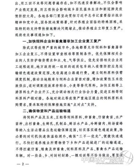 | 中國(guó)水產(chǎn)頻道綜合報(bào)道, 農(nóng)業(yè)農(nóng)村部辦公廳、國(guó)家發(fā)展改革委辦公廳、交通運(yùn)輸部辦公廳關(guān)于解決當(dāng)前實(shí)際困難加快養(yǎng)殖業(yè)復(fù)工復(fù)產(chǎn)的緊急通知 農(nóng)業(yè)農(nóng)村部辦公廳 國(guó)家發(fā)展改革委辦公廳 交通運(yùn)輸部辦公廳 關(guān)于解決當(dāng)前實(shí)際困難加快養(yǎng)殖業(yè)復(fù)工復(fù)產(chǎn)的緊急通知 各省、自治區(qū)、直轄市農(nóng)業(yè)農(nóng)村(農(nóng)牧)、畜牧獸醫(yī)、海洋與漁業(yè)廳(局、委),發(fā)展改革委,交通運(yùn)輸廳(局、委),新疆生產(chǎn)建設(shè)兵團(tuán)農(nóng)業(yè)農(nóng)村局、發(fā)展改革委、交通運(yùn)輸局: 肉蛋奶和水產(chǎn)品是居民生活必需品。新冠肺炎疫情發(fā)生以來(lái),養(yǎng)殖業(yè)發(fā)展遇到新的困難,飼料供不上、物資運(yùn)不進(jìn)、產(chǎn)品銷不出、用工回不來(lái)等問題普遍存在,如不迅速妥善解決,不僅會(huì)影響產(chǎn)業(yè)穩(wěn)定發(fā)展,而且很快會(huì)影響城鄉(xiāng)居民基本生活和新冠肺炎疫情防控大局。各地各部門要堅(jiān)決貫徹習(xí)近平總書記重要指示批示精神和黨中央、國(guó)務(wù)院決策部署,針對(duì)養(yǎng)殖業(yè)面臨的特殊困難,采取特別的支持幫扶措施解決問題堵點(diǎn),推動(dòng)養(yǎng)殖業(yè)立即復(fù)工復(fù)產(chǎn),F(xiàn)將有關(guān)事項(xiàng)通知如下。 一、加快飼料企業(yè)和畜禽屠宰加工企業(yè)復(fù)工復(fù)產(chǎn) 除武漢等疫情嚴(yán)重的城市外,各地都要允許飼料和畜禽屠宰加工企業(yè)復(fù)工,不得設(shè)置審查核準(zhǔn)等限制條件。優(yōu)先保障相關(guān)企業(yè)的人員防護(hù)物資需求和水、電、氣等供應(yīng)。優(yōu)先安排相關(guān)企業(yè)用工返程返崗,地方政府統(tǒng)一組織的返崗包車納入疫情防控應(yīng)急運(yùn)輸綠色通道政策范圍,免收高速公路通行費(fèi)。建立飼料原料供需調(diào)度機(jī)制,推動(dòng)當(dāng)?shù)丶Z庫(kù)與飼料企業(yè)緊密對(duì)接,增加政策性玉米投放供應(yīng),適時(shí)調(diào)配投放庫(kù)存稻谷、小麥等替代原料。加快豆粕等上游原料生產(chǎn)企業(yè)開工,充分調(diào)動(dòng)相關(guān)行業(yè)協(xié)會(huì)力量,促進(jìn)豆粕等飼料原料產(chǎn)銷對(duì)接。各地對(duì)湖北等疫情嚴(yán)重地區(qū)提出的飼料原料采購(gòu)需求,要采取特別保障措施實(shí)施“點(diǎn)對(duì)點(diǎn)”支持。 二、確保物資和產(chǎn)品運(yùn)輸暢通 將飼料產(chǎn)品及玉米、豆粕等飼料原料、種畜禽、仔豬禽苗、水產(chǎn)苗種、出欄畜禽、生鮮乳、乳制品、鮮活水產(chǎn)品、冷鮮豬肉、轉(zhuǎn)場(chǎng)蜜蜂等納入生活必需品應(yīng)急運(yùn)輸保障范圍,切實(shí)落實(shí)綠色通道政策,除必要的對(duì)司機(jī)快速體溫檢測(cè)外,確!叭灰粌(yōu)先”,便捷快速通行。盡快打通養(yǎng)殖業(yè)所需物資下鄉(xiāng)和產(chǎn)品進(jìn)城進(jìn)廠的運(yùn)輸通道,不得攔截仔畜、雛禽及種畜禽、飼料原料及產(chǎn)品、畜禽水產(chǎn)品運(yùn)輸車輛。對(duì)一些縣、鄉(xiāng)、村封村封路、一概勸返等不恰當(dāng)做法,要堅(jiān)決予以糾正。各地有關(guān)部門要公布聯(lián)系電話,安排專人接聽群眾來(lái)電【文章留言處已公布各地24小時(shí)值班電話】,及時(shí)解決所反映的具體問題。 三、千方百計(jì)推進(jìn)當(dāng)前養(yǎng)殖業(yè)解困 家禽業(yè)要突出解決好養(yǎng)殖缺飼料、禽苗運(yùn)不出和禽肉禽蛋賣難問題,幫助重點(diǎn)養(yǎng)殖場(chǎng)(戶)和飼料企業(yè)、屠宰企業(yè)建立對(duì)接機(jī)制,協(xié)調(diào)金融機(jī)構(gòu)解決家禽養(yǎng)殖企業(yè)流動(dòng)資金貸款,落實(shí)活禽交易市場(chǎng)分類管理、不搞一刀切,確保飼料不斷供、產(chǎn)品不滯壓、資金不斷流,必要時(shí)地方政府要采取禽肉、禽蛋產(chǎn)品臨時(shí)收儲(chǔ)措施。生豬要合力抓好生產(chǎn)恢復(fù)發(fā)展,“點(diǎn)對(duì)點(diǎn)”協(xié)調(diào)解決好建筑用工問題,加大建筑材料供應(yīng)和保障力度,確保各地新建和改擴(kuò)建生豬養(yǎng)殖項(xiàng)目盡快開工復(fù)工、投產(chǎn)達(dá)產(chǎn)。奶業(yè)要防止出現(xiàn)生鮮乳限收拒收特別是倒奶現(xiàn)象,督促收購(gòu)生鮮乳的乳品加工企業(yè)用好用足產(chǎn)能,嚴(yán)格履行生鮮乳購(gòu)銷合同,敞開收購(gòu)生鮮乳,支持采取生鮮乳噴粉等應(yīng)急措施。水產(chǎn)養(yǎng)殖要解決好對(duì)蝦、羅非魚、小龍蝦等產(chǎn)品壓塘嚴(yán)重問題,協(xié)調(diào)主產(chǎn)區(qū)和大中城市構(gòu)建銷售流通對(duì)接關(guān)系,充分發(fā)揮電商等渠道優(yōu)勢(shì),幫助重點(diǎn)水產(chǎn)加工企業(yè)盡快復(fù)工復(fù)產(chǎn)。 四、促進(jìn)畜禽水產(chǎn)品產(chǎn)銷銜接 加強(qiáng)畜禽水產(chǎn)品產(chǎn)銷調(diào)度分析,充分發(fā)揮行業(yè)協(xié)會(huì)等作用,建立產(chǎn)銷銜接平臺(tái),收集發(fā)布產(chǎn)銷信息,引導(dǎo)及時(shí)精準(zhǔn)對(duì)接,解決產(chǎn)品“賣不出”和“買不到”的問題。重點(diǎn)解決貧困地區(qū)特色養(yǎng)殖產(chǎn)品銷路問題,組織開展多種形式的產(chǎn)銷對(du