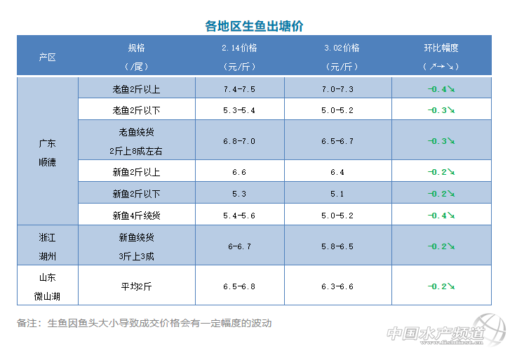 | 中國水產頻道原創(chuàng)報道, 文/圖 何氏水產、水產前沿 李靜 生魚 1、由于這段時間加工廠開工人手不足,開工量不大,很多農戶春節(jié)積壓了很多魚要出魚,市場銷量供大于求,價格下跌了。目前存塘老魚還有很多,新魚也不少,市場行情與上周情況差不多,沒有明顯的好轉,開工的收購商還是不多,由于大魚市場還沒有全面開通,大魚銷量沒有好轉,老魚開塘量還是不大。老魚2斤以上價格在7.0-7.3元/斤左右,比上周下跌了0.4元/斤。2斤以下是5.0-5.2元/斤,比上周下跌了0.3元/斤。2斤以上統(tǒng)貨價格6.5-6.7元/斤,比上周也下跌了0.3元/斤。新魚新魚2斤以上5成左右的統(tǒng)貨價與上周相比下降了0.2元/斤,5成2斤以上價格在5.2元/斤,6成2斤以上價格在5.4元/斤左右。目前生魚存塘量較大,預計價格或將持續(xù)下跌,銷量會慢慢上升。 2、浙江湖州、山東微山湖兩個主產區(qū)本周價格比上周也下跌了0.2元/斤,情況與上周差不多,銷量還是不多。 |