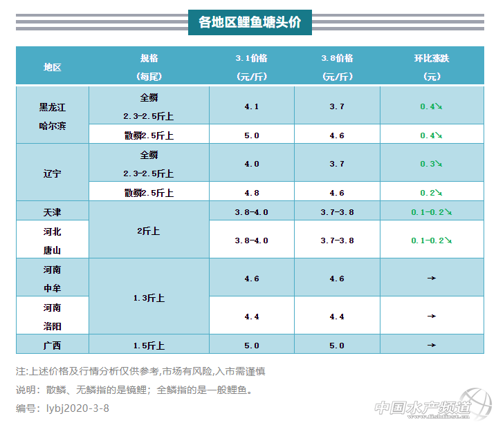 | 中國(guó)水產(chǎn)頻道原創(chuàng)報(bào)道, 冬天出魚少,存塘密度高,降雪多,許多鯉魚處于亞健康狀態(tài),養(yǎng)殖戶不敢繼續(xù)留著 文/ 水產(chǎn)前沿 葉豐齊 代表產(chǎn)區(qū)鯉魚行情走勢(shì) 整體行情綜述 本周多地區(qū)鯉魚跌價(jià),少數(shù)產(chǎn)區(qū)價(jià)格與上周持平;黑龍江全鱗鯉魚價(jià)格較上周下調(diào)0.4元/斤,散鱗較上周下調(diào)0.4元/斤;遼寧全鱗鯉魚價(jià)格較上周下調(diào)0.3元/斤,散鱗較上周下調(diào)0.2元/斤;天津、唐山2斤以上規(guī)格鯉魚較上周下調(diào)0.1-0.2元/斤;河南中牟、洛陽1.3斤以上規(guī)格鯉魚保持上周行情;廣西1.5斤規(guī)格鯉魚同上周價(jià)格。 本周各地區(qū)鯉魚行情一覽 東北地區(qū):有將近50%的鯉魚存塘,目前養(yǎng)殖戶都想出魚,但市場(chǎng)終端需求量;因?yàn)檫@個(gè)冬天出魚少,存塘密度高,降雪多,許多鯉魚處于亞健康狀態(tài),養(yǎng)殖戶不敢繼續(xù)留著,著急出魚被魚中壓價(jià);黑龍江2.3-2.5斤以上規(guī)格全鱗鯉魚3.7元/斤,環(huán)比上周下調(diào)0.4元/斤,2.5斤以上規(guī)格散鱗鏡鯉4.6元/斤,環(huán)比上周下調(diào)0.4元/斤;遼寧同規(guī)格的全鱗3.7元/斤,環(huán)比上周下調(diào)0.3元/斤,散鱗4.6元/斤,環(huán)比上周下調(diào)0.2元/斤;業(yè)者表示,還有一個(gè)星期魚池就都開化了,沒有封冰后養(yǎng)殖戶的出魚需求會(huì)增加,只怕后市行情不太理想。 河北唐山和天津地區(qū):河北唐山鯉魚大約還有30-40%的存塘量,而天津剩下20-30%左右;天津鯉魚存塘最多的是寶坻,養(yǎng)殖戶著急,出魚量稍大,基本都是清塘鯉魚,因缺少外地車,只能供應(yīng)本地超市和水產(chǎn)市場(chǎng);水車?yán)贿^來,消化能力也有限,清塘魚和亞健康的魚量大也讓魚價(jià)走低。 河南地區(qū):流通需求依然很小,鯉魚價(jià)格暫時(shí)保持,1.3斤以上規(guī)格鄭州中牟4.6元/斤,同上周;洛陽4.4元/斤,同上周價(jià)格;因越冬魚掉重,養(yǎng)戶目前出魚意愿不強(qiáng),都在看后市行情,業(yè)者估計(jì)4月中旬鯉魚會(huì)比較走量。 廣西地區(qū):當(dāng)?shù)厥袌?chǎng)1.5斤以上規(guī)格鯉魚5元/斤,同上周價(jià)格;貴州市場(chǎng)偏好的3兩左右小規(guī)格鯉魚銷量不俗,水車抓魚價(jià)格4.8/斤,同上周行情。 |