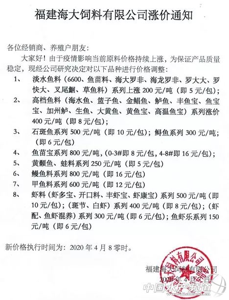| 中國(guó)水產(chǎn)頻道獨(dú)家報(bào)道, 又見(jiàn)水產(chǎn)料漲價(jià)!華中、華南、華東全線暴漲! 文/ 水產(chǎn)前沿 唐東東 4月8日零時(shí)起,福建海大、福建恒興、福建澳華、福建粵海、福建大北農(nóng)等企業(yè)的蝦料、淡水料、海特料等品種開(kāi)始上調(diào)價(jià)格,標(biāo)志著福建水產(chǎn)料正式全線開(kāi)漲。據(jù)悉,廈門通威將于4月10日同步上漲。 從企業(yè)反饋來(lái)看,上調(diào)水產(chǎn)料價(jià)格,主要是受原料價(jià)格持續(xù)上漲所影響。我們來(lái)看下主要飼料原料的最新動(dòng)態(tài):1.豆粕。目前,沿海豆粕主流價(jià)格在2910-3200元/噸之間,受大豆到港量不足影響,油廠大多已無(wú)豆粕現(xiàn)貨可售,普遍限量提貨,因此豆粕現(xiàn)貨價(jià)格仍具有較強(qiáng)的抗跌性。截止4月3日,國(guó)內(nèi)沿海主要地區(qū)油廠豆粕總庫(kù)存量16.78萬(wàn)噸,較上一周的27.27萬(wàn)噸減少10.49萬(wàn)噸,降幅在38.47%,較去年同期60.84萬(wàn)噸減少72.41%。 2.魚(yú)粉。4月8日,秘魯魚(yú)粉外盤報(bào)價(jià)1720美元,進(jìn)口成本相當(dāng)于為1720×7.04匯率+350碼頭操作費(fèi)=12458元。目前,國(guó)內(nèi)秘魯超級(jí)蒸汽魚(yú)粉報(bào)價(jià)在13700-14000元/噸。可見(jiàn),國(guó)內(nèi)魚(yú)粉市場(chǎng)強(qiáng)于外盤。主要原因是當(dāng)前港口庫(kù)存量較少,且到港魚(yú)粉量少,而水產(chǎn)養(yǎng)殖逐漸進(jìn)入正軌,飼料企業(yè)備貨的積極性增加。據(jù)了解,截止到2020年4月7日,國(guó)內(nèi)港口魚(yú)粉庫(kù)存為12.3萬(wàn)噸,相比4月1日時(shí)的13.37萬(wàn)噸繼續(xù)下降。 此前,華中、華南水產(chǎn)料已暴漲,幾乎涵蓋所有特水料、海水料、蝦料等中高檔飼料。至此,全國(guó)三大水產(chǎn)養(yǎng)殖區(qū)全線上漲。 附:各大料企漲價(jià)通知 福建海大飼料有限公司漲價(jià)通知 福建恒興飼料有限公司調(diào)價(jià)通知 尊敬的廣大經(jīng)銷商和養(yǎng)殖戶朋友們,受疫情影響,豆粕、魚(yú)粉等原料價(jià)格高企,為了保證產(chǎn)品質(zhì)量,經(jīng)公司研究決定于2020年04月08日零時(shí)起對(duì)公司產(chǎn)品價(jià)格進(jìn)行調(diào)整,具體調(diào)整如下: 1.蝦料系列:蝦貝肽上調(diào)1000元/噸;益蝦肽、金剛肽上調(diào)500元/噸;康蝦肽、斑節(jié)料、高檔白蝦料上調(diào)400元/噸;普通白蝦料(916、915系列),泥鰍料和混養(yǎng)料(9073)上調(diào)300元/噸; 2.特種膨化料系列:石斑魚(yú)料、海水魚(yú)苗料(666#)上調(diào)500元/噸;籃子魚(yú)料、加州鱸魚(yú)料、黃顙魚(yú)料、高檔海水魚(yú)料上調(diào)400元/噸;蛙料(含蝌蚪粉、蝌蚪粒)上調(diào)250元/噸。 3.淡水魚(yú)料系列:淡水魚(yú)膨化料系列(含粉料)上調(diào)200元/噸;顆粒魚(yú)料上調(diào)150元/噸。特此通知,衷心感謝客戶朋友們長(zhǎng)期以來(lái)的支持,祝您養(yǎng)殖順利! 福建恒興飼料有限公司 2020年4月7日 福建澳華農(nóng)牧科技有限公司漲價(jià)通知 福建大北農(nóng)水產(chǎn)科技有限公司漲價(jià)通知 尊敬的事業(yè)伙伴、養(yǎng)殖戶朋友大家好: 感謝大家一直以來(lái)對(duì)我司的支持和關(guān)心,由于近期原料受疫情影響,魚(yú)粉,豆粕等持續(xù)上漲,本公司為保證產(chǎn)品質(zhì)量,以用戶為中心,產(chǎn)品質(zhì)量為魂,經(jīng)公司研究決定,于2020年4月8日零時(shí)起,對(duì)公司產(chǎn)品價(jià)格進(jìn)行調(diào)整,具體調(diào)整如下: 1、高檔海水料:(海水通用料、金鯧魚(yú)、籃子魚(yú)、大黃魚(yú)、加州鱸魚(yú))系列上調(diào)400元/噸。 2、高檔蝦料: 。ò吖(jié)90系、對(duì)蝦80系)、南美白對(duì)蝦(81/82)系列上調(diào)400元/噸: 泥鰍料/蝦配料(83/73)/蝦農(nóng)樂(lè)/兆星對(duì)蝦系列價(jià)格上調(diào)300元/噸; 3、神爽系列:(石斑魚(yú)料/鲆鰈魚(yú)料/神爽蝦料/蝦倍康/魚(yú)蝦康/鰻魚(yú)料/神爽大黃魚(yú)/鱉料)上調(diào)500元/噸。 4、蛙料系列上調(diào)250元/噸。 5、淡水料: 草魚(yú)顆粒料、混養(yǎng)料系列上調(diào)150元/噸; 膨化料(羅非料、草魚(yú)料、苗種料、叉尾專用料)價(jià)格上調(diào)200元/噸; 6、神爽至尊9102A/神爽開(kāi)口寶價(jià)格上調(diào)1000元/噸; 特此通知! 感謝您對(duì)公司的支持! 2020,無(wú)我瘋狂,無(wú)我顛覆,無(wú)我神爽! 福建大北農(nóng)水產(chǎn)科技有限公司 福建粵海飼料有限公司調(diào)價(jià)通知 尊敬的廣大經(jīng)銷商和養(yǎng)殖戶朋友:由于全球疫情影響,今年以來(lái)原材料價(jià)格高企,為確保產(chǎn)品質(zhì)量,經(jīng)公司研究決定,從2020年4月8日零時(shí)起,對(duì)以下產(chǎn)品進(jìn)行漲價(jià): 1、普水魚(yú)料: 膨化料漲價(jià)200元/噸;沉水料漲價(jià)150元/噸。 2、海特魚(yú)料: 海水魚(yú)料、籃子魚(yú)料、大黃魚(yú)料、加州鱸料漲價(jià)400元/噸。 牛蛙料、黃顙魚(yú)料漲價(jià)250元/噸。石斑魚(yú)料漲價(jià)500元/噸。 魚(yú)寶貝:930系列漲1000元/噸;931系列:9311漲價(jià)500元/噸,9312、9313、9314、9813漲1000元/噸。 3、蝦料系列: 蝦金剛豐蝦料漲價(jià)500元/噸,精養(yǎng)白蝦料、草蝦料、白蝦料漲價(jià)400元/噸、87系列漲價(jià)300元/噸、配合料漲價(jià)200元/噸、混養(yǎng)料漲價(jià)150元/噸。 特此通知,衷心感謝客戶朋友們長(zhǎng)期以來(lái)的支持,祝您