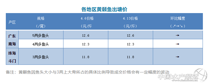 | 中國水產(chǎn)頻道原創(chuàng)報道, 文/圖 何氏水產(chǎn)、水產(chǎn)前沿 李靜 黃顙魚 1、本周廣東黃顙魚價格保持穩(wěn)定,5.0兩魚頭的報價12.6元/斤;4兩多魚頭報價12.3元/斤;3兩多魚頭價格11.8元/斤。預計接下來價格變化不大,銷量跟上周差不多。 2、浙江湖州的黃顙魚也開始有一定的銷量,但近期病魚很多,市場價格較亂。 |