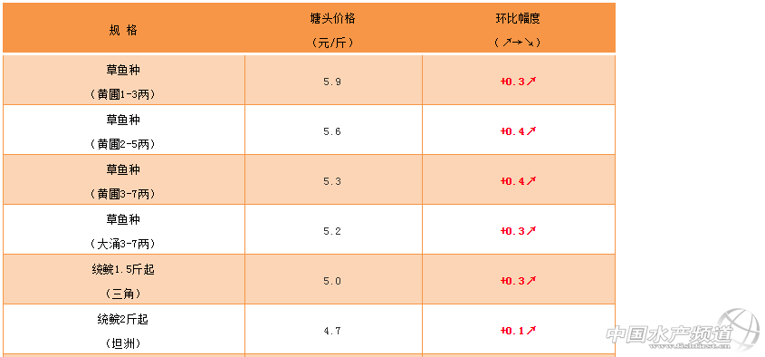 文/ 珠海海龍、水產(chǎn)前沿 何鴻浩 中國水產(chǎn)頻道原創(chuàng)報道,草魚種:本周價格繼續(xù)穩(wěn)中有升,漲幅在0.3-0.4元/斤。受投苗量減少及現(xiàn)階段需求增大的影響,后續(xù)預測價格還會有一定上漲。近期魚價上漲較快,不少養(yǎng)殖戶開始轉(zhuǎn)用高檔次飼料投喂,但需要在轉(zhuǎn)料過程中注意內(nèi)服保健工作。 統(tǒng)鯇:行情持續(xù)走俏,1.5斤規(guī)格較上周上漲0.3元/斤,達到5.0元/斤;2斤上規(guī)格較上周上漲0.1–0.2元/斤,達到4.8–5.0元/斤。 大草魚:價格保持穩(wěn)定,4斤上規(guī)格保持5.7元/斤;5斤上規(guī)格保持6.2元/斤。 脆肉鯇:本周價格依舊穩(wěn)定,供需平衡,存塘主要在幾個魚中手上,由于后期養(yǎng)殖成本增大,后市價格看漲。近期氣溫回暖,脆肉鯇加料明顯,建議做好內(nèi)服保護肝腸健康。 |