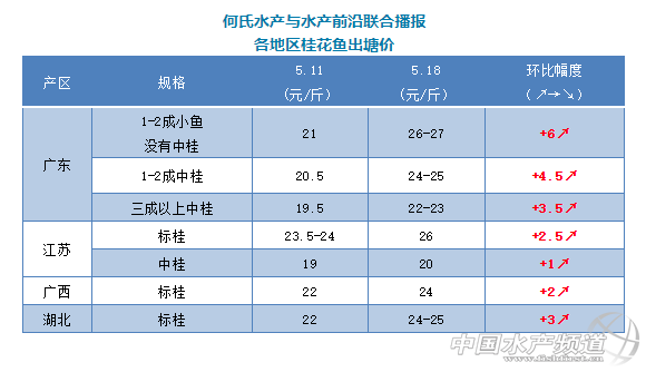 | 中國水產(chǎn)頻道原創(chuàng)報道, 文/圖何氏水產(chǎn)、水產(chǎn)前沿李靜 桂花魚 本周鱖魚塘頭一天一個價格,漲勢驚人。1-2成小魚沒有中桂開塘價26-27元/斤,比上周上漲了6元/斤;1-2成中桂開塘價24-25元/斤,比上周上漲了4.5元/斤;三成以上中桂價格是22-23元/斤,比上周也上漲了3.5元/斤。目前廣東鱖魚存塘量還是比較多的,但是大多養(yǎng)戶賣跌不賣漲,出魚積極性較低。前段時間流通商訂的魚,價格一開始升,部分養(yǎng)戶就撻了定,導(dǎo)致市場缺魚,搶魚搶高了價格。預(yù)計接下來價格或許還有小幅上漲。 除廣東外,江蘇地區(qū)的標(biāo)桂價格也上漲了2.5元/斤,報價是26元/斤;中桂價格比上周也上漲了1元/斤,報價是20元/斤。湖北桂魚價格本周上漲了3元/斤,標(biāo)桂價格是24-25元/斤。廣西標(biāo)桂本周價格也上漲了2元/斤,報價24元/斤。 |