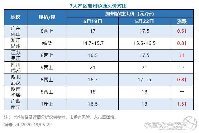 | 中國水產(chǎn)頻道原創(chuàng)報道, 養(yǎng)好魚,更要賣好魚! 加州鱸行情周報 《鱖鱸前沿》與您相約每周五 行情大漲,部分地區(qū)缺魚 文/圖鱖鱸前沿賀志義 廣東稍顯爛市!敖裉熘皇1萬多斤加州鱸,17.5元/斤(8兩上)!5月22日,據(jù)佛山一流通商介紹,前幾天價格連續(xù)上漲太快,市場需要時間接受,現(xiàn)在魚價有點高,銷量開始有減少的趨勢,感覺有點賣不動,這兩天的抓魚量也減少了一些,再加上這兩天的“龍舟水”降水量太大,對銷量也有一定的影響?傮w來說這兩天價格穩(wěn)定下來之后,開始出魚的養(yǎng)殖戶也多了,預(yù)計這個價格會穩(wěn)定一段時間。 佛山朝苗報價:8朝苗價格為0.38元/尾,8.5朝為0.45元/尾,9朝0.63元/尾左右,目前高溫天氣幾乎沒有省外客戶拿苗,當(dāng)?shù)仞B(yǎng)殖戶不急于放苗,目前魚苗價格比較低迷。 吳江地區(qū)“碼頭”開業(yè),魚價普漲1元/斤!皡墙a頭昨天開業(yè),按照往年慣例,開業(yè)當(dāng)天魚價上漲1元/斤,目前8兩上17.5元/斤,9兩上18元/斤!眳墙(dāng)?shù)匾火B(yǎng)殖大戶告訴筆者,昨天以9兩上的規(guī)格為主,收魚量特別大,下午多在缺魚開塘,估計昨天一天的交易量在50萬斤左右,以銷往北方市場為主。 吳江魚價大漲,也促進浙江湖州地區(qū)魚價上漲,目前統(tǒng)貨15.5-16.5元/斤,同比5月19日上漲0.8元/斤,當(dāng)?shù)?兩上規(guī)格的也上漲1元/斤,養(yǎng)殖戶出魚積極性也還不錯,市場整體情況較好。 廣西缺魚,7兩上規(guī)格魚也開始出塘!笆袌霰容^缺魚,大規(guī)格魚也比較少,早上還拉了兩車7兩上的魚。”廣西流通商李老板講到,當(dāng)?shù)赝撂琉B(yǎng)殖1斤上的目前在18元/斤左右,品質(zhì)好一些的網(wǎng)箱魚可以賣到19元/斤,因為可以拉到成都市場銷售。 |