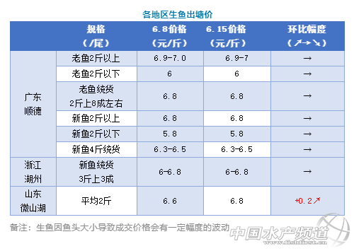 | 中國(guó)水產(chǎn)頻道原創(chuàng)報(bào)道, 生魚(yú) 1、本周廣東生魚(yú)價(jià)格保持穩(wěn)定,塘頭報(bào)價(jià)老魚(yú)2斤以上6.9-7.0元/斤;2斤以下報(bào)價(jià)6元/斤;老魚(yú)統(tǒng)貨2斤上8成左右報(bào)價(jià)6.8元/斤;新魚(yú)2斤上報(bào)價(jià)6.8元/斤;2斤以下報(bào)價(jià)5.8元/斤;4斤左右統(tǒng)貨報(bào)價(jià)6.3-6.5元/斤。雖然臨近端午,但疫情形勢(shì)不穩(wěn),端午市場(chǎng)銷(xiāo)量難以把握。加工車(chē)間受影響不大,中魚(yú)市場(chǎng)銷(xiāo)量保持不變。預(yù)計(jì)接下來(lái)生魚(yú)價(jià)格或?qū)⒊址(wěn)一段時(shí)間。 2、浙江湖州本周價(jià)格保持穩(wěn)定,新魚(yú)統(tǒng)貨3斤上3成左右報(bào)價(jià)6-6.8元/斤。山東微山湖產(chǎn)區(qū)本周價(jià)格上漲了0.2元/斤,平均2斤報(bào)價(jià)6.8元/斤,銷(xiāo)量跟平時(shí)差不多。 |