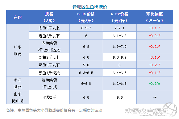 | 中國(guó)水產(chǎn)頻道原創(chuàng)報(bào)道, 文/圖何氏水產(chǎn)、水產(chǎn)前沿李靜 生魚(yú) 1、本周廣東生魚(yú)塘頭報(bào)價(jià)老魚(yú)2斤以上6.8-6.9/斤,比上周上漲了0.1元/斤;2斤以下報(bào)價(jià)6元/斤,比上周上漲了0.2元/斤;新魚(yú)4斤統(tǒng)貨6.4-6.6元/斤,比上周上漲了0.1元/斤;老魚(yú)統(tǒng)貨2斤上8成左右報(bào)價(jià)6.9-7.0元/斤,比上周上漲了0.2元/斤;2斤上報(bào)價(jià)7-7.1,比上周上漲了0.1元/斤;2斤以下報(bào)價(jià)6.1-6.2元/斤,比上周也上漲了0.2元/斤。臨近端午,走貨量有所上升,但養(yǎng)戶(hù)出魚(yú)意愿不高,惜售待價(jià)心理增強(qiáng)。預(yù)計(jì)接下來(lái)價(jià)格上漲空間不大。 2、浙江湖州本周報(bào)價(jià)新魚(yú)統(tǒng)貨3斤上3成左右報(bào)價(jià)6.2-6.5元/斤,比上周下跌了0.3元/斤。山東微山湖產(chǎn)區(qū)本周價(jià)格保持穩(wěn)定,平均2斤報(bào)價(jià)6.8元/斤,本周銷(xiāo)量稍有上升。 |