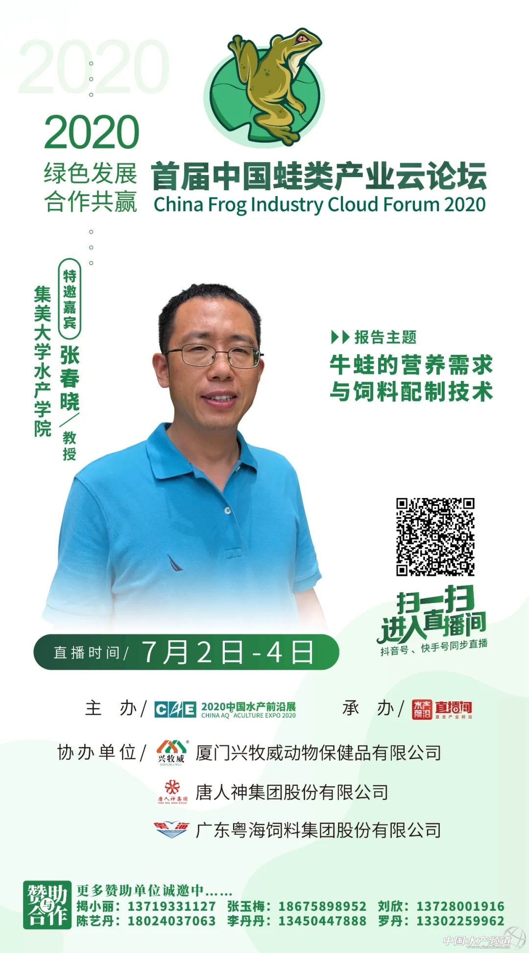 | 中國水產(chǎn)頻道原創(chuàng)報道, 2020年7月2日-4日,鎖定水產(chǎn)前沿直播間,我們不見不散 文/水產(chǎn)前沿陳曉慶 據(jù)統(tǒng)計,2019年全國牛蛙養(yǎng)殖產(chǎn)量50萬噸、黑斑蛙產(chǎn)量8萬噸,整個蛙類產(chǎn)業(yè)鏈價值超2000億人民幣。以蛙類為主題的餐廳也從2017年下半年開始火遍全網(wǎng)。 但在生產(chǎn)端,蛙類養(yǎng)殖目前還存在著很多問題,特別是養(yǎng)殖環(huán)境、食品安全方面,仍然存在著隱患。在經(jīng)歷了新冠期間的“禁養(yǎng)禁食”風波劫難之后,黑斑蛙、牛蛙等徹底解決了身份問題,但接下來還要面對的是如何實現(xiàn)行業(yè)可持續(xù)發(fā)展等問題。蛙類消費端的需求日益增長,值得業(yè)者與行業(yè)企業(yè)大力開拓創(chuàng)新,合力解決發(fā)展中的問題。 針對于此,水產(chǎn)前沿將聯(lián)合蛙類產(chǎn)業(yè)領(lǐng)域最前沿專家、企業(yè),一起探究2020年蛙類養(yǎng)殖策略,為綠色健康養(yǎng)殖建言獻策。 【云論壇主題】 綠色發(fā)展•合作共贏 【組織單位】 主辦: 中國水產(chǎn)前沿展 承辦: 水產(chǎn)前沿+直播 水產(chǎn)前沿短視頻 協(xié)辦: 廈門興牧威動物保健品有限公司 唐人神集團股份有限公司 廣東粵海飼料集團股份有限公司 更多贊助單位誠邀中…… 【直播時間及入口】 直播時間 2020年7月2日-4日 直播入口 ↓↓↓ 【特邀嘉賓】 報告題目:牛蛙的營養(yǎng)需求與飼料配制技術(shù) 特邀嘉賓:集美大學水產(chǎn)學院張春曉教授 張春曉:博士,集美大學水產(chǎn)學院院長、教授、博士生導師,國家海水魚產(chǎn)業(yè)技術(shù)體系海鱸營養(yǎng)需求與飼料崗位科學家,福建省高校新世紀優(yōu)秀人才,兼任中國水產(chǎn)學會水產(chǎn)動物營養(yǎng)與飼料專業(yè)委員會委員、中國水產(chǎn)學會青年工作委員會秘書長、福建省水產(chǎn)學會常務理事。長期從事水產(chǎn)動物營養(yǎng)與飼料學領(lǐng)域的理論和應用研究,曾主持國家自然科學基金、公益性農(nóng)業(yè)行業(yè)專項子項目以及省市和橫向等各類科研項目20余項。獲教育部科技進步一等獎1項,在國內(nèi)外刊物發(fā)表論文60余篇,其中SCI收錄30余篇;參編教材1部,譯著1部;授權(quán)國家發(fā)明專利10項,其中3項專利已向企業(yè)有償轉(zhuǎn)讓。 報告題目:蛙類健康養(yǎng)殖問題與對策 特邀嘉賓:湖南農(nóng)業(yè)大學動物科學技術(shù)學院陳開健博士、副教授 陳開。1989年畢業(yè)于湖南農(nóng)學院牧水系。陳開健副教授研究方向為水產(chǎn)養(yǎng)殖,主要開展水產(chǎn)動物營養(yǎng)與品質(zhì)、水產(chǎn)生態(tài)模式、淡水龍蝦、蛙類產(chǎn)業(yè)化等研究。2012年以來多年擔任湖南省、長沙市、長沙縣、望城區(qū)科技特派員、企業(yè)的相關(guān)研發(fā)項目等工作,促進了水產(chǎn)養(yǎng)殖產(chǎn)業(yè)的發(fā)展。陳開健副教授從教近三十年,出版國家級教材《水產(chǎn)養(yǎng)殖工程學》(副主編,中國農(nóng)業(yè)出版社)、《淡水小龍蝦健康養(yǎng)殖技術(shù)》(副主編),參編《餌料生物學》、《水產(chǎn)動物行為與行為生態(tài)學》、《水產(chǎn)養(yǎng)殖專業(yè)技能學》教材;參加完成國家863中試計劃、主持省級重點項目1項,科技攻關(guān)項目2個,其他項目多項,主要參與國家自科基金項目一項,其他項目多項;主持洮水水庫生態(tài)漁業(yè)利用規(guī)劃、柘溪水庫生態(tài)漁業(yè)規(guī)劃、天心區(qū)水域灘涂規(guī)劃以及作為長沙市水產(chǎn)百里走廊規(guī)劃和古丈棲鳳湖生態(tài)漁業(yè)規(guī)劃主要參與者等;水產(chǎn)核心期刊發(fā)表論文40余篇,其中SCI5篇,發(fā)明專利3個,實用新型專業(yè)7個,主持制定標準1項,參與標準制定3個;已培養(yǎng)碩士研究生5名,發(fā)明專利8項,其他專利多項,省教學成果二等獎1項,教學成果獎一等獎2項,湖南省科技進步二等獎2項,廳級科技獎2項。主要社會兼職:中國水產(chǎn)學會會員,湖南省水產(chǎn)學會會員,中國淡水龍蝦會員,長沙市遠程教育專家,長沙市科技助農(nóng)直通車水產(chǎn)咨詢專家。 報告題目:蛙類養(yǎng)殖病害的發(fā)生和控制 特邀嘉賓:湖南省水產(chǎn)科學研究所魚病研究室宋銳主任 宋銳:理學博士,水產(chǎn)高級工程師,湖南省水產(chǎn)學會常務理事。2011年7月博士畢業(yè)于中國科學院水生生物研究所,2012年3月至今在湖南省水產(chǎn)科學研究所科研部工作,主要從事水產(chǎn)經(jīng)濟動物病害防控工作。2014年起,任魚病研究室主任,主持魚病研究室工作。獲得農(nóng)業(yè)部農(nóng)林牧漁豐收獎二等級1項,湖南省農(nóng)業(yè)豐收獎一等獎1項,發(fā)表論文10余篇,其中SCI收錄8篇,參編專著5部,獲得實用新型專利3項,制定地方標準1項。 實地直播:牛蛙的健康養(yǎng)殖 互動嘉賓:廈門興牧威動物保健品有限公司陳龍偉總經(jīng)理 采訪嘉賓:廈門興牧威動物保健品有限公司林武平技術(shù)總監(jiān) 陳龍偉:廈門興牧威動物保健品有限公司總經(jīng)理,2002年從事牛蛙產(chǎn)業(yè)至今,綠色牛蛙養(yǎng)殖和綠色牛蛙產(chǎn)業(yè)倡導者。 林武平:廈門興牧威動物保健品有限公司技術(shù)顧問。 報告題目:華中黑斑蛙養(yǎng)殖技術(shù)探討與投喂策略 特邀嘉賓:唐人神集團特種水產(chǎn)料公司譚欣鑫總經(jīng)理 