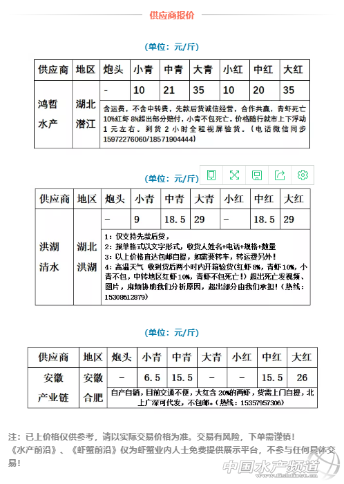 | 中國水產(chǎn)頻道原創(chuàng)報(bào)道, 水產(chǎn)前沿專業(yè)為你推送小龍蝦, 最新價(jià)格行情及行業(yè)新聞、各類資訊。 同時(shí)歡迎行業(yè)人士踴躍爆料, 請(qǐng)掃二維碼聯(lián)系。 昨天大青才32塊,今天已經(jīng)35塊! 文/ 蝦蟹前沿實(shí)習(xí)編輯 曾鈴程 從6月底的持續(xù)大雨,內(nèi)澇嚴(yán)重,據(jù)業(yè)內(nèi)人士估計(jì)小龍蝦受災(zāi)面積超過了50%。目前雨水漸弱,內(nèi)澇消退,可是對(duì)小龍蝦業(yè)影響已經(jīng)開始暴露! 潛江蝦寶農(nóng)業(yè)科技公司(簡稱“潛江蝦寶”)的陳居茂老師曾對(duì)《蝦蟹前沿》表示,他們1500畝精養(yǎng)塘,摸排情況近60%區(qū)域受到嚴(yán)重影響,必須要立即搶救,甚至有部分區(qū)域不得不重新開始。如今外圍水已經(jīng)開始退去,潛江蝦寶已經(jīng)開始恢復(fù)供應(yīng),可是嚴(yán)重缺貨,只能優(yōu)先供應(yīng)老客戶。 據(jù)中國蝦谷“鴻哲水產(chǎn)”負(fù)責(zé)人表示現(xiàn)在市場(chǎng)主要是缺少大蝦,目前個(gè)體商戶中很少有人能夠有1000斤6錢上大蝦,可是在高峰期,就“鴻哲水產(chǎn)”4錢上的龍蝦日出貨都能達(dá)到1萬斤!昨天大青才32塊,今天已經(jīng)35塊!現(xiàn)在蝦價(jià)太貴,每天只能現(xiàn)收現(xiàn)發(fā)。 最新的中國蝦谷360直營中心的價(jià)格也已經(jīng)調(diào)到了35塊!特青(炮頭)更是達(dá)到了49塊!據(jù)中國蝦谷運(yùn)營中心內(nèi)部人士介紹,這主要是因?yàn)槟壳按笠?guī)格蝦供應(yīng)不足的關(guān)系,目前稻蝦已經(jīng)沒有了供應(yīng),主要是精養(yǎng)蝦,又遭遇到了水災(zāi),供需不平衡帶動(dòng)了行情上漲。 “熊蝦子”的熊總也介紹說,大雨之前養(yǎng)殖戶都在擔(dān)心,很多都搶著出存塘蝦,目前能夠上市的更少了。這也是目前價(jià)格上揚(yáng)的一個(gè)重要因素。 注:以上價(jià)格僅供參考 對(duì)這個(gè)問題,監(jiān)利某小龍蝦優(yōu)質(zhì)苗企也對(duì)《蝦蟹前沿》表示,雖然監(jiān)利地區(qū)內(nèi)澇問題不算嚴(yán)重,可是今年市場(chǎng)普遍缺少大規(guī)格蝦產(chǎn)出,再加上前期市場(chǎng)行情又弱,也導(dǎo)致了恐慌出貨,后期轉(zhuǎn)精養(yǎng)塘養(yǎng)大蝦并不多,更加劇了市場(chǎng)大規(guī)格蝦供不應(yīng)求的情況。 不僅災(zāi)情存在區(qū)域差異,區(qū)域間價(jià)格差異也比較大。據(jù)安徽合肥某供應(yīng)商介紹,他手上主要多是中青以下的龍蝦,6錢上大蝦非常少,大紅報(bào)價(jià)自提價(jià)格是26塊!市場(chǎng)大規(guī)格龍蝦越發(fā)供不應(yīng)求的情況下,部分偏僻區(qū)域可能也會(huì)迎來利好行情。 行情風(fēng)向標(biāo) 。〝(shù)據(jù)來源:近兩周“中國蝦谷360”價(jià)格) |