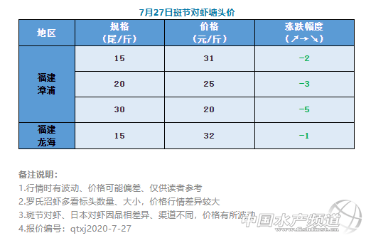 | 中國水產(chǎn)頻道原創(chuàng)報(bào)道, 本周斑節(jié)對蝦、羅氏沼蝦出現(xiàn)較大震蕩 文/水產(chǎn)前沿何鴻浩 一周要聞 1、整體蝦市均不景氣 近日,南美白對蝦塘頭價(jià)整體仍在低位,批發(fā)市場偶有“爆市”好消息傳出,但對價(jià)格的推動力也十分有限。顯然,作為對蝦風(fēng)向標(biāo)的白蝦不景氣,其余對蝦品種也沒辦法很好地獨(dú)善其身。 2、羅氏沼蝦下滑明顯 本周各地羅氏沼蝦價(jià)格下滑明顯,市場情況不佳,唯有高郵地區(qū)逆勢上漲。肇慶從業(yè)者表示,近期市場爛市,爛到一塌糊涂,有部分人都暫時(shí)歇業(yè)了。但并非只是消費(fèi)市場的原因,同樣也跟流通從業(yè)者有關(guān)。近兩年,從事流通的人越來越多,小車也越來越多。往往這些幾百斤的小車因?yàn)橘Y金壓力不大,經(jīng)常低價(jià)拋售,更是加劇了市場亂象。 3、斑節(jié)對蝦大幅震蕩 本周福建斑節(jié)對蝦價(jià)格出現(xiàn)劇烈波動,30條規(guī)格最高跌幅達(dá)5元/斤。福建從業(yè)者表示,近期斑節(jié)對蝦價(jià)格持續(xù)走低,市場的消費(fèi)意愿也不是特別高。海南養(yǎng)蝦人表示,海南價(jià)格也不好,打算把蝦全部養(yǎng)大,養(yǎng)到中秋博一個(gè)高價(jià)。 |