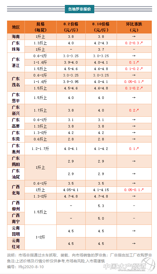 | 中國(guó)水產(chǎn)頻道原創(chuàng)報(bào)道, 由于行情有持續(xù)走高的趨勢(shì),業(yè)者認(rèn)為在9月份放苗養(yǎng)越冬魚(yú)的養(yǎng)戶可能不在少數(shù) 文/ 水產(chǎn)前沿 葉豐齊 水產(chǎn)前沿專(zhuān)業(yè)為你推送羅非魚(yú) 最新價(jià)格行情及行業(yè)新聞、各類(lèi)資訊。 代表產(chǎn)區(qū)羅非魚(yú)行情走勢(shì) 一周要聞 2020年8月7日起,出口美國(guó)的中國(guó)原產(chǎn)小規(guī)格羅非魚(yú)被重新征收25%的關(guān)稅。這種規(guī)格包裝不超出115克,使用的原料魚(yú)基本為9兩-1.2斤的羅非魚(yú),介于6兩-1斤規(guī)格小非和1-1.6斤規(guī)格中非之間。有加工企業(yè)發(fā)言人表示,小非一直是公司出口美國(guó)市場(chǎng)的優(yōu)勢(shì)產(chǎn)品,恢復(fù)加征25%關(guān)稅必然對(duì)公司既有業(yè)務(wù)造成一定影響,但是沒(méi)有辦法,全體員工要工作、要吃飯,只能邊做邊觀望。 百洋水產(chǎn)集團(tuán)有限公司運(yùn)營(yíng)中心常務(wù)副總監(jiān)黃琨表示,(恢復(fù)25%關(guān)稅)影響肯定有,但不會(huì)是重大的影響。小非是針對(duì)美國(guó)零售市場(chǎng)部分的,需求始終會(huì)有,只是今年上半年(美方)關(guān)稅政策的調(diào)整促使客戶集中在這個(gè)階段收購(gòu)進(jìn)口。事實(shí)上小非訂單基本出口得差不多了,從7月份開(kāi)始,已經(jīng)比較明顯地轉(zhuǎn)到了中大規(guī)格方向,因?yàn)槌隹谀厦篮椭袞|地區(qū)的羅非魚(yú)也不少,其他國(guó)家也有一定的消費(fèi)需求存在。經(jīng)過(guò)前一段時(shí)間的小非出塘,現(xiàn)在氣溫和水量都有一定的好轉(zhuǎn),從目前收購(gòu)情況來(lái)看,養(yǎng)殖戶對(duì)小非的出魚(yú)意愿相比之前下降了不少,加上價(jià)格有一定的上浮,更多的是惜售等價(jià),而加工企業(yè)更多是針對(duì)訂單對(duì)收購(gòu)價(jià)格作出調(diào)整。 肇慶恒興水產(chǎn)科技有限公司總經(jīng)理謝海認(rèn)為,小規(guī)格的羅非魚(yú)片產(chǎn)品還是消費(fèi)主流。按照正常情況,超市始終在用此規(guī)格的產(chǎn)品,基本上是銷(xiāo)量最大的。哪怕關(guān)稅重收,在美國(guó)疫情嚴(yán)重的前提下,超市還是最佳的購(gòu)買(mǎi)渠道,大眾的經(jīng)濟(jì)消費(fèi)都不會(huì)太講究,廉價(jià)的羅非魚(yú)算是一個(gè)好的選擇。由于大規(guī)格魚(yú)價(jià)格要更高,而且不太適合家庭消費(fèi),小規(guī)格自然是最有優(yōu)勢(shì)的。 整體行情綜述 本周多產(chǎn)區(qū)羅非魚(yú)價(jià)格穩(wěn)定,部分地區(qū)行情繼續(xù)上調(diào);海南地區(qū)各規(guī)格羅非魚(yú)價(jià)格與上周持平;珠三角地區(qū),珠海1斤上廠非3.7元/斤,1.3斤上市場(chǎng)非價(jià)格上調(diào)0.2-0.3元/斤,新興1.5斤上市場(chǎng)非上調(diào)0.2元/斤,高要和恩平羅非價(jià)格暫時(shí)保持,東莞1.2斤上規(guī)格市場(chǎng)非外省車(chē)開(kāi)價(jià)上調(diào)0.6元/斤;粵東地區(qū)惠州1.2-2斤規(guī)格羅非價(jià)格上調(diào)0.1元/斤,揭陽(yáng)和汕尾地區(qū)廠非與市場(chǎng)非行情依舊保持不變;粵西地區(qū)湛江和茂名廠非0.6-1斤規(guī)格價(jià)格不變,1-1.6斤規(guī)格廠非價(jià)格上調(diào)0.05-0.1元/斤,1.3-1.5斤上規(guī)格市場(chǎng)非上調(diào)0.1-0.2元/斤;廣西地區(qū)北海0.6斤上規(guī)格廠非價(jià)格持平,1斤上規(guī)格廠非上調(diào)0.05-0.1元/斤,市場(chǎng)非價(jià)格暫時(shí)穩(wěn)定,南寧1.2斤上市場(chǎng)非4.5-4.6元/斤,1.5斤上規(guī)格5元/斤,柳州1.5-2斤規(guī)格羅非5.2-5.3元/斤,欽州、防城港1.2斤上羅非4.5-4.6元/斤,1.5斤上4.8-4.9元/斤;云南地區(qū)昆明和紅河羅非價(jià)格依然保持與上周一致。 各產(chǎn)地行情分析 海南地區(qū):0.6-1斤規(guī)格廠非收購(gòu)價(jià)2.8元/斤,1斤上規(guī)格廠非3.8元/斤,皆與上周行情一致,而1斤上規(guī)格塘頭現(xiàn)金收購(gòu)價(jià)3.5-3.6元/斤,同上周。西線市場(chǎng)1斤上市場(chǎng)非塘頭價(jià)3.5-3.6元/斤,保持上周行情。 珠三角地區(qū):珠海1斤上廠非3.7元/斤;1.3斤上規(guī)格市場(chǎng)非4.2-4.3元/斤,環(huán)比上周上調(diào)0.2-0.3元/斤;而5-9斤大羅非塘頭價(jià)8.5元/斤,保持上周行情。東莞1.3-2斤以上規(guī)格水車(chē)走珠三角市場(chǎng)羅非塘頭價(jià)4.2元/斤,同上周價(jià)格;而6兩上廠非2.8元/斤,依然維持上周行情;外省車(chē)抓1.2斤上統(tǒng)貨4.2元/斤,環(huán)比上周上調(diào)0.6元/斤。恩平1.5斤以上規(guī)格市場(chǎng)非4元/斤,同上周價(jià)格,工廠非6兩上2.8元/斤,1斤上3.8元/斤,皆與上周行情一致;新興1.7-1.8斤上規(guī)格市場(chǎng)非到手價(jià)4元/斤,環(huán)比上周上調(diào)0.2元/斤,一車(chē)普遍裝5千斤左右,與其他品種一并出魚(yú),水車(chē)也較多,整體來(lái)說(shuō)比之前好市,2-3斤上市場(chǎng)非3.9-4元/斤,暫同上周價(jià)格。肇慶1.3斤上市場(chǎng)非塘頭價(jià)3.8元/斤,0.6-1斤規(guī)格廠非2.6-3.1元/斤,1-1.6斤規(guī)格3.55元/斤,1.6斤上3.3元/斤,皆與上周行情一致。 粵東地區(qū):惠州1.2-2斤規(guī)格走本地市場(chǎng)羅非早上車(chē)4.1元/斤,下午車(chē)4.2元/斤,環(huán)比上周皆上調(diào)0.1元/斤。揭陽(yáng)和汕尾1斤以上規(guī)格廠非(走汕尾本地凍廠)塘頭價(jià)2.9元/斤,1-1.2斤上規(guī)格市場(chǎng)非3.3-3.4元/斤,暫時(shí)仍保持上周
