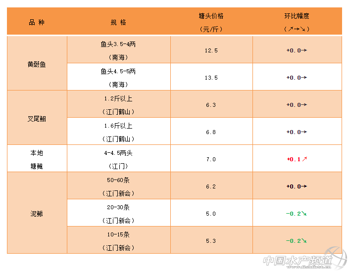 | 中國(guó)水產(chǎn)頻道原創(chuàng)報(bào)道, 文/ 水產(chǎn)前沿 何鴻浩 無(wú)鱗魚(yú):泥鰍再度下滑,塘鲺微漲 南海區(qū)域黃顙魚(yú) 目前市場(chǎng)價(jià)格穩(wěn)定,養(yǎng)殖戶都在盼望國(guó)慶利好,望魚(yú)價(jià)有所上升。 |