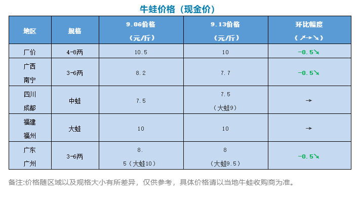 | 中國水產(chǎn)頻道原創(chuàng)報(bào)道, 本周牛蛙價(jià)格微跌,黑斑蛙行情仍然低迷 文/ 水產(chǎn)前沿 陳曉慶 一周要聞 環(huán)保風(fēng)暴又起?清遠(yuǎn)、河源多地又現(xiàn)禁養(yǎng)拆遷 近日,廣東清遠(yuǎn)七拱鎮(zhèn)、河源紫金縣等多地開展牛蛙養(yǎng)殖污染整治工作,清場出蛙增多。 2020年9月10日,七拱鎮(zhèn)組織召開了2020年七拱鎮(zhèn)牛蛙養(yǎng)殖污染整治工作會(huì)議。會(huì)議上,鎮(zhèn)長肖劍平首先通報(bào)了最近的牛蛙養(yǎng)殖排查情況,目前發(fā)現(xiàn)合上村委會(huì)有10家、石角村委會(huì)有2家、西路村委會(huì)有1家、桂花村委會(huì)有1家、龍虎坑村委會(huì)有1家偷養(yǎng)牛蛙。接著,肖劍平宣讀了與禁養(yǎng)牛蛙有關(guān)的《通告》,提出了幾點(diǎn)要求:一是提高意識(shí)、認(rèn)識(shí),表明禁養(yǎng)牛蛙的態(tài)度,對(duì)牛蛙養(yǎng)殖污染“零容忍”,全面徹底排查,從嚴(yán)從快執(zhí)法,發(fā)現(xiàn)一起、打擊一起,決不手軟、決不遷就。二是村干部需提升政治覺悟,不得帶頭養(yǎng)殖牛蛙,積極配合整治工作,不得縱容,不得瞞報(bào)。三是加大宣傳力度,利用公眾號(hào)、大喇叭宣傳牛蛙禁養(yǎng)相關(guān)事宜。鎮(zhèn)村干部要入村入戶,對(duì)已養(yǎng)殖的養(yǎng)殖戶派發(fā)承諾書,要求其自行退場、整改。四是加大執(zhí)法力度,綜合執(zhí)法隊(duì)、環(huán)保、國土資源、派出所、水利等相關(guān)職能部門要開展聯(lián)合執(zhí)法,從嚴(yán)執(zhí)法,決不手軟,情節(jié)嚴(yán)重的,移送司法機(jī)關(guān)追究法律責(zé)任。 此外,9月9日,河源市紫金縣養(yǎng)殖戶也收到了縣農(nóng)業(yè)農(nóng)村局的牛蛙養(yǎng)殖場整改通知,要求在9月16日前自行退養(yǎng)、拆除清理養(yǎng)殖設(shè)施。 在此也呼吁養(yǎng)殖戶以合法的手續(xù)進(jìn)行牛蛙養(yǎng)殖,健康養(yǎng)殖,保護(hù)生態(tài)。 一天損失3000多斤,投料過猛導(dǎo)致牛蛙病害頻發(fā) 有從業(yè)人員表示,近期海南、廣西等地牛蛙病害高發(fā),養(yǎng)殖戶損失慘重。 海南一養(yǎng)殖場一天損失3000多斤,原因是之前投料過猛,牛蛙生了富貴病。據(jù)了解,該養(yǎng)殖場老板之前是從事泰蛙養(yǎng)殖的,牛蛙泰蛙養(yǎng)殖周期差別大,轉(zhuǎn)養(yǎng)牛蛙之后沒把控好度,投料過猛,導(dǎo)致現(xiàn)在發(fā)病嚴(yán)重。無獨(dú)有偶,廣西、海南等地也有不少泰蛙轉(zhuǎn)養(yǎng)牛蛙的養(yǎng)殖場由于投料不當(dāng)發(fā)病的。之前牛蛙處于高價(jià),有的養(yǎng)殖戶為了趕價(jià)猛投料,甚至一天投喂3餐,導(dǎo)致現(xiàn)階段發(fā)病嚴(yán)重,不得不提前出蛙止損。 牛蛙行情 今日牛蛙主流廠家報(bào)價(jià)(廠價(jià)):4-8兩10.0元/斤,4-7兩/9.5元/斤,3-7兩/9.0元/斤,3-6兩8.5元/斤,3-5兩/8.0元/斤,2-5兩/7.5元/斤,2-4兩/7.0元/斤。以上價(jià)格僅供參考,不同地區(qū)價(jià)格有所差異。 本周大蛙、中蛙價(jià)格有所下跌,小蛙價(jià)格穩(wěn)定。和上周相似,本周大蛙、中蛙價(jià)格從周一周二開始下跌,到了周五4-8兩的蛙已經(jīng)跌到了9.5元/斤,而周末又回漲到了10元/斤。小蛙價(jià)格一直穩(wěn)定在7-7.5元/斤。 之前不少業(yè)內(nèi)人士猜測9月中旬蛙價(jià)有可能上漲,9月初蛙價(jià)也出現(xiàn)了一些上漲的苗頭,但廣東清遠(yuǎn)、河源等地相繼出現(xiàn)環(huán)保拆遷,清場出蛙的老板增多,再加上近期病害問題也在增多,導(dǎo)致價(jià)格不漲反跌。 黑斑蛙行情 目前黑斑蛙行情仍然處于低迷狀態(tài),市場方面表示賣不動(dòng)。昨晚江西南昌黑斑蛙塘口最高12元/斤,便宜的9元/斤結(jié)賬。而離長沙馬王堆市場比較近的張老板表示,目前黑斑蛙8錢起帶炮頭的賣12元/斤,小一點(diǎn)的在10-11元/斤左右,離市場比較近所以價(jià)格相對(duì)要高一些。有業(yè)內(nèi)人士表示,馬王堆市場黑斑蛙恢復(fù)銷售只是解決了養(yǎng)殖戶資金緊張的問題,但市場方面仍然賣不動(dòng)。 |