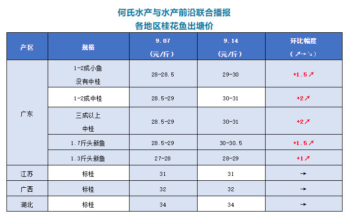 | 中國(guó)水產(chǎn)頻道原創(chuàng)報(bào)道, 文/圖 何氏水產(chǎn)、水產(chǎn)前沿 李靜 桂花魚(yú) 上周,關(guān)閉約三個(gè)月的北京新發(fā)地市場(chǎng)全部復(fù)市,曾關(guān)閉整改的北京京深海鮮市場(chǎng)也陸續(xù)恢復(fù)經(jīng)營(yíng)。北方市場(chǎng)全面開(kāi)放市場(chǎng)需求增加,加速了鱖魚(yú)的流通,量?jī)r(jià)齊漲! 本周廣東鱖魚(yú)行情持續(xù)好轉(zhuǎn),價(jià)格也在逐步回升。1-2成小魚(yú)沒(méi)有中桂開(kāi)塘29-30元/斤,比上周上漲了1.5元/斤;1-2成中桂開(kāi)塘價(jià)30-31元/斤,比上周上漲了2元/斤;三成以上中桂價(jià)格也是30-31元/斤,比上周上漲了2元/斤。新魚(yú)1.7斤魚(yú)頭比上周上漲1.5元/斤,塘頭報(bào)價(jià)30-30.5元/斤;1.3斤魚(yú)頭價(jià)格比上周也上漲了1元/斤,報(bào)價(jià)28-29元/斤。近期廣東鱖魚(yú)價(jià)格持續(xù)穩(wěn)步上升,但今天開(kāi)始小標(biāo)和中標(biāo)有點(diǎn)爛市,預(yù)計(jì)現(xiàn)在開(kāi)始到27號(hào)前銷量不大,且外省多病魚(yú)上市,受此影響,接下來(lái)價(jià)格或?qū)?huì)有小幅回落。 廣西產(chǎn)區(qū)標(biāo)桂價(jià)格基本穩(wěn)定,價(jià)格還是32元/斤,當(dāng)?shù)睾苌亵~(yú)出了;湖北產(chǎn)區(qū)標(biāo)桂價(jià)格本周也保持穩(wěn)定,報(bào)價(jià)還是34元/斤,當(dāng)?shù)乩萧~(yú)基本結(jié)束,新魚(yú)還未上市;江蘇州地區(qū)標(biāo)桂本周保持穩(wěn)定,價(jià)格還是31元/斤。 |