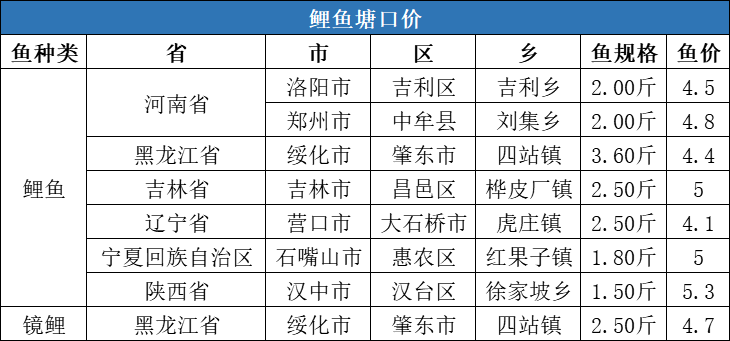 | 中國水產(chǎn)頻道報道, 鯉魚 本周全國鯉魚塘口均價4.73元/斤,同比下跌9.39%,環(huán)比上漲1.28%。 華北地區(qū):河南地區(qū)鯉魚規(guī)格以1.5斤-2斤為主,2斤以上魚較少,市場需求量增加,價格較上周上漲0.2元/斤。遼寧地區(qū)近期流通量增加,但養(yǎng)殖戶出魚較多,價格較上周下跌0.1元/斤。黑龍江、吉林地區(qū)鯉魚價格與上周持平。 華西地區(qū):銀川地區(qū)鯉魚價格與上周持平。(本文轉(zhuǎn)自【通威農(nóng)牧】。如有版權(quán)問題,敬請聯(lián)系wx@fishfirst.cn。) |