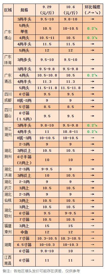 | 中國(guó)水產(chǎn)頻道原創(chuàng)報(bào)道, 國(guó)慶市場(chǎng)銷量略有增加,出魚量仍較大,魚價(jià)未能增加,總體維穩(wěn) 文/ 水產(chǎn)前沿 林貞武 10月6日各產(chǎn)區(qū)塘頭報(bào)價(jià) 一周要聞 要聞1:黃顙魚行情國(guó)慶期間較為穩(wěn)定,市場(chǎng)銷量略有增加,但是各大產(chǎn)區(qū),特別是華東華北等地區(qū),黃顙魚新口逐步上市,對(duì)老口魚的價(jià)格造成一定的影響,白露后魚塘易出問(wèn)題,華南區(qū)域腸炎等問(wèn)題較為突出,對(duì)價(jià)格也會(huì)有影響,近期出魚增多,甚至部分區(qū)域出現(xiàn)扎堆現(xiàn)象! 要聞2:本周苗價(jià)暫時(shí)維穩(wěn),湖南100口斤以內(nèi)價(jià)格為12元/斤,50-80尾的11元/斤。廣東佛山產(chǎn)區(qū)200口斤為6.5分/尾,300口斤為6分/尾,400口斤為5.5分/尾,500尾5分/尾,100口斤為8.5分/尾,,30至70口的8元/斤。四川苗價(jià)為一斤500左右的,5分一尾。湖北200尾1毛/尾。 一周行情分析 2018-2020年湖北武漢3兩上黃顙魚成品魚價(jià)格走勢(shì) 廣東佛山黃顙魚本周價(jià)格維穩(wěn)。外省水車較少,本地銷售為主,新魚養(yǎng)殖戶出魚欲望強(qiáng)烈,單性黃顙魚大量上市,老魚與新魚并存,價(jià)格互相影響,病魚明顯增多,國(guó)慶銷量稍大,價(jià)格維穩(wěn)。雜交黃顙魚3.5兩塘頭價(jià)為9.5-10元/斤,新魚3兩頭只有9元/斤,4兩魚頭的塘頭發(fā)價(jià)為11元/斤之間,4兩多頭的塘頭價(jià)為11.5元/斤,5兩頭的價(jià)格為12元/斤,單性5兩頭塘頭價(jià)跌至10.5元/斤。近期現(xiàn)在出魚的人太多了,銷量雖有增加,但魚價(jià)總體上低迷。 廣東清遠(yuǎn)本周價(jià)格維穩(wěn)。近期清遠(yuǎn)現(xiàn)在基本上沒(méi)什么塘頭可以出魚,3兩半頭塘頭報(bào)價(jià)為9.5元/斤左右,4兩半頭為11.3元/斤,5兩頭為11.8-12元/斤,預(yù)計(jì)下個(gè)月能有小部分新魚上市,價(jià)格不容樂(lè)觀。 四川本周價(jià)格維穩(wěn)。國(guó)慶期間,很多外來(lái)人員回老家,市場(chǎng)銷量一般。,老口還剩下少量存塘,近期賣魚的養(yǎng)殖戶還是比較積極。成都2-3兩的塘頭發(fā)價(jià)為9.5-10元/斤,眉山5寸篩新魚發(fā)價(jià)8.5元/斤,6寸篩發(fā)價(jià)9.5元/斤。 浙江湖州本周價(jià)格微跌0.2元/斤。湖州市場(chǎng)繼續(xù)爛市,這陣子新魚病魚齊上市,很多大車隊(duì)跑去外地抓魚,價(jià)格比較亂,養(yǎng)殖戶開始理性出魚了。目前3兩多炮頭的魚塘頭發(fā)價(jià)為9.5-9.8元/斤之間,4.5兩頭11元/斤,業(yè)界表示這段時(shí)間估計(jì)很難上漲。 湖北本周價(jià)格維穩(wěn)。據(jù)了解湖北產(chǎn)區(qū)這幾天銷量一般,但是比前幾天好了點(diǎn),養(yǎng)殖戶賣魚欲望減低,價(jià)格有所回暖,有江西、安徽、河南等武漢周圍的城市的魚車過(guò)來(lái)拉魚。目前6.5寸篩3.8-4兩頭9.5-10元/斤,6寸篩9元/斤,7寸篩10.5元/斤,當(dāng)前武漢白沙洲市場(chǎng)日走貨量大概為6-7萬(wàn)斤左右,6寸篩批發(fā)價(jià)只有10-10.5元/斤左右。受新魚上市影響,有流通商認(rèn)為后市可能存在跌價(jià)風(fēng)險(xiǎn)。 湖南本周價(jià)格維穩(wěn)。湖南本地魚價(jià)魚價(jià)暫時(shí)波動(dòng)不大,市場(chǎng)銷量有所增加,暫時(shí)魚不難賣,雖然出魚多,新魚少,老魚走勢(shì)穩(wěn)定,價(jià)格應(yīng)該暫時(shí)穩(wěn)得住。6寸篩規(guī)格塘頭報(bào)價(jià)為9.8-10元/斤,6.5寸篩10-10.3元/斤,7寸篩10.3-10.5元/斤,6寸篩批發(fā)價(jià)為10.8元/斤。業(yè)界表示近期當(dāng)?shù)厥芴鞖庥绊懗鲷~量不大,后面天氣好了慢慢會(huì)出的多,目前走貨量在6-8萬(wàn)斤/天。 福建漳州市場(chǎng)價(jià)格維持穩(wěn)定,二級(jí)魚12元/斤,3兩上一級(jí)魚塘頭價(jià)為15元/斤。廣西貴港4-5兩塘頭價(jià)為12.5元/斤,2-3兩11元/斤。 江西南昌本周價(jià)格維穩(wěn)。近期走貨量差不多,6寸篩魚為11-11.2元/斤,新魚上市沖擊市場(chǎng),價(jià)格接下來(lái)預(yù)計(jì)會(huì)相對(duì)穩(wěn)定一點(diǎn),養(yǎng)殖戶需合理安排出魚。 佛山市金浦飼料實(shí)業(yè)有限公司提供 批發(fā)市場(chǎng)波動(dòng)較大,一天一個(gè)價(jià)。 |
