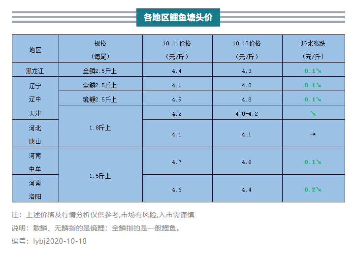 | 中國水產(chǎn)頻道原創(chuàng)報道, 本周各主產(chǎn)區(qū)鯉魚行情繼續(xù)呈下行趨勢,全國大降溫,后市或看漲 文/ 水產(chǎn)前沿 實習(xí)編輯 吳寧靜 代表產(chǎn)區(qū)鯉魚行情走勢 整體行情綜述 節(jié)后綜合征猶在,本周全國鯉魚仍是不走量,但部分養(yǎng)殖戶出魚較為積極,市場供應(yīng)量較大,再加上草魚等多種淡水魚爭搶市場,多個地區(qū)鯉魚行情不樂觀,價格均出現(xiàn)下滑,但全國大降溫下,魚市或許能迎來轉(zhuǎn)機。 本周各地區(qū)鯉魚行情一覽 遼寧地區(qū):遼寧地區(qū)走魚量還是不佳,市場流通慢,有些養(yǎng)殖戶需要資金周轉(zhuǎn),愿意降價賣魚,出魚較多,價格較上周環(huán)比下跌0.1元/斤,2.5斤上鯉魚報價4.0元/斤,2.5斤上鏡鯉報價4.8元/斤。 黑龍江地區(qū):黑龍江地區(qū)還是因雙節(jié)出魚較多,價格繼續(xù)下跌,近期再加上草魚大量上市沖擊鯉魚市場,價格較上周環(huán)比下跌0.1元/斤,2.5斤上報價4.3元/斤,2.5斤上鏡鯉報價4.8元/斤。 天津和河北唐山地區(qū):天津地區(qū)大規(guī)格鯉魚存塘量較少,小規(guī)格魚也走量一般,價格較上周有下跌趨勢,大規(guī)格報價4.0-4.1元/斤,2斤左右的報價4.1-4.2元/斤。唐山地區(qū)養(yǎng)殖戶出魚較為積極,走量一般。 河南地區(qū):本周河南地區(qū)鯉魚存塘量較大,加上中牟地區(qū)的河灘拆遷,養(yǎng)殖戶迫不得已出魚,鯉魚大量上市導(dǎo)致市場供應(yīng)量較大,價格較是上周下跌0.1-0.2元/斤,1.5斤上中牟報價4.6元/斤,洛陽4.4元/斤。 |