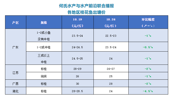 | 中國水產(chǎn)頻道原創(chuàng)報道, 文/圖 何氏水產(chǎn)、水產(chǎn)前沿 李靜 桂花魚 本周廣東鱖魚新魚價格持續(xù)下跌。主要原因是外省新魚集中上市,加上蟹塘也有部分推出市場且價格比廣東魚便宜,所以近期鱖魚價格下滑趨勢明顯。本周市場行情還是沒有好轉(zhuǎn),總體銷量持續(xù)下滑;1-2成小魚沒有中桂開塘22.5-23元/斤,比上周下跌了1.0元/斤;1-2成中桂開塘價在23.5-24元/斤,比上周也下跌了0.5元/斤;三成以上中桂新魚24元/斤,比上周下跌了1元/斤。目前外省蟹塘鱖魚陸續(xù)上市,魚頭小的也有8-9兩,最大的也有1斤6-7兩。預(yù)計11月中旬還會有大量蟹塘鱖魚集中出魚,價格還會持續(xù)下跌。 廣西產(chǎn)區(qū)標桂比上周價格下跌了2元/斤,價格只剩下28元/斤,當?shù)睾苌亵~出了;湖北產(chǎn)區(qū)標桂價格本周持續(xù)下跌了4.5元/斤,報價在24元/斤,當?shù)匦诽烈查_始上市了,價格暴跌;江蘇地區(qū)標桂價格比上周下跌了2元/斤,報價26-27元/斤,統(tǒng)貨下跌了1元/斤,價格只有25元/斤。預(yù)計接下來價格很難有上漲的機會。 |