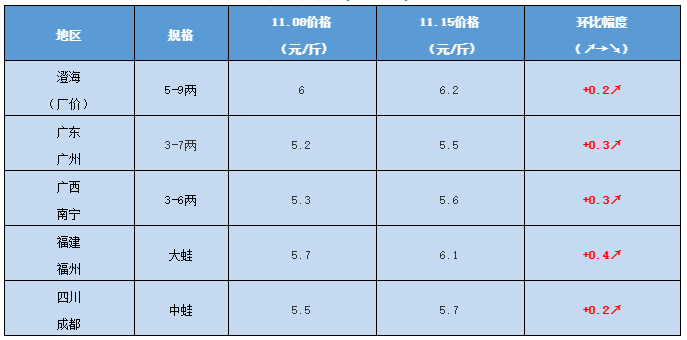 文/ 水產(chǎn)前沿 陳曉慶 牛蛙行情 中國水產(chǎn)頻道原創(chuàng)報道,今日牛蛙報價(廠價):5-9兩報價6.2元/斤,4-8兩報價6.1/斤,3-7兩:6元/斤。以上價格僅供參考,不同地區(qū)價格有所差異。 本周牛蛙價格略有上漲,主要是小蛙漲幅較大,相比上周上漲了0.4元/斤,中大蛙相比上周只上漲了0.2元/斤,目前各地小蛙存塘量開始減少,價格上升空間較大,大蛙價格預(yù)計會保持穩(wěn)定,大蛙小蛙的價格差距逐漸拉小。 現(xiàn)金價格方面,廣東廣州3-7兩蛙現(xiàn)金報價5.5元/斤,4-7兩蛙報價5.6元/斤,福建福州大蛙6.1元/斤,四川成都小蛙5.5元/斤中蛙5.7元/斤,各地現(xiàn)金價格都上調(diào)了0.3-0.4元/斤。 牛蛙苗方面,本周價格已經(jīng)有所下跌,目前在2.5-3分/尾。 牛蛙價格(現(xiàn)金價) 備注:價格隨區(qū)域以及規(guī)格大小有所差異,僅供參考,具體價格請以當(dāng)?shù)嘏M苁召徤虨闇?zhǔn)。 黑斑蛙行情 上周黑斑蛙價格觸底反彈,上調(diào)1-1.5元/斤,本周黑斑蛙價格持穩(wěn)。近期冷空氣依然比較“弱勢”,全國各地溫度還是偏高,蛙價上漲預(yù)計還得再等等。 黑斑蛙價格 |