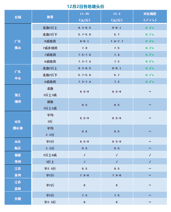 | 中國(guó)水產(chǎn)頻道原創(chuàng)報(bào)道, 廣東生魚(yú)價(jià)下跌,省外維穩(wěn),養(yǎng)殖戶(hù)惜售,業(yè)界表示這兩天估計(jì)要漲! 文/水產(chǎn)前沿林貞武 一周要聞 廣東魚(yú)價(jià)下跌0.4元/斤,后市或?qū)⒋蠓蠞q 生魚(yú)新魚(yú)、舊魚(yú)都下跌了,跌幅為0.3-0.4元/斤,2斤上老魚(yú)大魚(yú)定塘價(jià)8-8.1元/斤,裝車(chē)價(jià)8.3元/斤左右,新魚(yú)2斤上大魚(yú)裝車(chē)價(jià)7-7.2元/斤。上星期筆者有談到這個(gè)擔(dān)憂(yōu),養(yǎng)殖戶(hù)出魚(yú)積極性低,北方天冷出魚(yú)逐步減少,后市應(yīng)該是看漲,但也要明白目前的批發(fā)市場(chǎng)銷(xiāo)量并沒(méi)有顯著增加,而市場(chǎng)銷(xiāo)量才是保證行情穩(wěn)步發(fā)展的支柱,養(yǎng)殖戶(hù)需要時(shí)刻關(guān)注市場(chǎng)變化,有利則出!果真,生魚(yú)行情又下滑了,業(yè)內(nèi)表示廣東跌價(jià)是3天前就開(kāi)始了,有人猜測(cè)可能跟年底養(yǎng)殖戶(hù)面對(duì)飼料款、塘租等壓力,不得已得出部分魚(yú)還債有關(guān)。但據(jù)了解,這幾天出魚(yú)的養(yǎng)殖戶(hù)并不多,日走貨量約維持在300萬(wàn)斤,魚(yú)中也表示這次跌價(jià)來(lái)得很奇怪,明明其他淡水魚(yú)隨著氣溫下降都在升價(jià)了,生魚(yú)卻跌了!筆者了解到,目前部分客戶(hù)資源比較多而且穩(wěn)定的流通商,走魚(yú)量比較順利,手里沒(méi)有積累太多“高價(jià)魚(yú)”,但也有少部分流通商手里有高價(jià)定的魚(yú)還沒(méi)出,壓力比較大。目前大多數(shù)人持漲價(jià)的想法,認(rèn)為隨著氣溫下降,魚(yú)存塘也少,大規(guī)格魚(yú)青黃不接,未來(lái)魚(yú)價(jià)應(yīng)會(huì)直線大升,最快會(huì)在這兩天開(kāi)始! 省外魚(yú)價(jià)穩(wěn)定,看好后市 據(jù)悉,隨著氣溫下降,本周除廣東產(chǎn)區(qū)以外,其余山東、安徽、湖南、江蘇、福建、浙江等地的魚(yú)價(jià)基本上維持穩(wěn)定,其中特別是山東,基本上都很少出魚(yú)了,大部分養(yǎng)殖戶(hù)打算留塘更多雄(公)魚(yú),等明年開(kāi)春價(jià)格上漲時(shí)出售,故各個(gè)產(chǎn)區(qū)的養(yǎng)殖戶(hù)目前的出魚(yú)積極性很低,市場(chǎng)走貨反而有加快跡象,養(yǎng)殖戶(hù)以等價(jià)為主,對(duì)后市看好! 各產(chǎn)地行情與報(bào)價(jià) 本周各個(gè)品種魚(yú)價(jià)有跌有漲:黃顙魚(yú)再漲0.8元/斤,浙江草魚(yú)最高漲0.5元/斤,羅非魚(yú)最高漲0.2元/斤,鱖魚(yú)最高漲1.5元/斤,加州鱸魚(yú)最高漲0.2元/斤。近期隨著天氣降溫,魚(yú)價(jià)有了回暖的趨勢(shì),甚至是大幅度上漲,多種淡水魚(yú)魚(yú)價(jià)上漲,生魚(yú)卻下跌了。那么在這新舊之間,養(yǎng)戶(hù)惜售的時(shí)間段,又有什么漲價(jià)的機(jī)遇呢?歡迎留言區(qū)評(píng)論。 廣東佛山本周價(jià)格最高跌0.4元/斤。本周廣東生魚(yú)爆冷,出現(xiàn)跌價(jià)現(xiàn)狀,據(jù)悉市場(chǎng)日走魚(yú)量大致為300萬(wàn)斤左右,市場(chǎng)應(yīng)該說(shuō)是比較順,但是據(jù)說(shuō)外部市場(chǎng)好像不太能接受高價(jià),魚(yú)中表示本次跌價(jià)是有點(diǎn)奇怪,估計(jì)過(guò)幾天會(huì)回漲。目前新魚(yú)2斤上塘頭價(jià)7-7.2元/斤左右,裝車(chē)價(jià)7.2-7.5元/斤,主要看魚(yú)頭大小,新魚(yú)2斤上5成統(tǒng)貨6.1-6.2元/斤。舊魚(yú)2斤上塘頭價(jià)8-8.1元/斤,裝車(chē)價(jià)8.3-8.5元/斤,老魚(yú)2斤上7成多統(tǒng)貨7.5元/斤,2斤上8成統(tǒng)貨7.6元/斤,2斤上6成統(tǒng)貨7.2元/斤。舊魚(yú)比較少了,基本上一個(gè)村沒(méi)有剩下幾塘魚(yú)了,新魚(yú)魚(yú)頭不夠大而且少,加上養(yǎng)殖戶(hù)惜售,后市依舊看漲。 廣東中山本周價(jià)格下跌0.4元/斤。大致情況與佛山類(lèi)似,老魚(yú)2斤上6成統(tǒng)貨7.2元/斤,2斤上7成多7.5元/斤,2斤上塘頭價(jià)8-8.1元/斤,中魚(yú)塘頭價(jià)5.7元/斤;旧犀F(xiàn)在觀望的養(yǎng)殖戶(hù)比較多,業(yè)界表示如果養(yǎng)殖戶(hù)繼續(xù)按照這種趨勢(shì),后市預(yù)計(jì)會(huì)漲。 山東本周價(jià)格維穩(wěn)。近期山東生魚(yú)行情還是老樣子,走市場(chǎng)的魚(yú)很少,基本上平均2斤價(jià)格為8.5-9元/斤之間,平均2.5斤價(jià)格為9-9.5元/斤,市場(chǎng)流通快了點(diǎn)。養(yǎng)殖戶(hù)出魚(yú)積極性較低,很多就等著明年開(kāi)春發(fā)公魚(yú)了,目前微山湖少量2斤挑公魚(yú)9.5元/斤?傮w養(yǎng)殖戶(hù)賣(mài)魚(yú)很少,基本在等價(jià)格。 浙江湖州本周價(jià)格維穩(wěn)。湖州當(dāng)?shù)厥袌?chǎng)銷(xiāo)售總量變化不大,價(jià)格本周未有大變化,養(yǎng)殖戶(hù)出魚(yú)積極性低,基本沒(méi)人賣(mài)魚(yú),魚(yú)販找魚(yú)增多。目前新口魚(yú)3斤上2成價(jià)格為8-8.5元/斤,當(dāng)?shù)乩萧~(yú)3斤上3成好魚(yú)8.5-9元/斤。 江蘇本周價(jià)格維穩(wěn)。當(dāng)?shù)靥鞖忾_(kāi)始涼了,市場(chǎng)銷(xiāo)量不大,養(yǎng)殖戶(hù)惜售,近幾天價(jià)格平穩(wěn)。目前平二斤塘頭價(jià)8元/斤,2.5斤價(jià)格為8.5元/斤,相對(duì)而言還是大魚(yú)價(jià)格高,也好走量! 安徽本周價(jià)格維穩(wěn)。近期安徽市場(chǎng)價(jià)格有點(diǎn)亂,但總體和上周保持一致,市場(chǎng)銷(xiāo)售量略有所增加。目前平1.6斤的魚(yú)塘頭價(jià)6.7-7元/斤,平2斤塘頭價(jià)為7.5元/斤,平2.5斤上8元/斤,