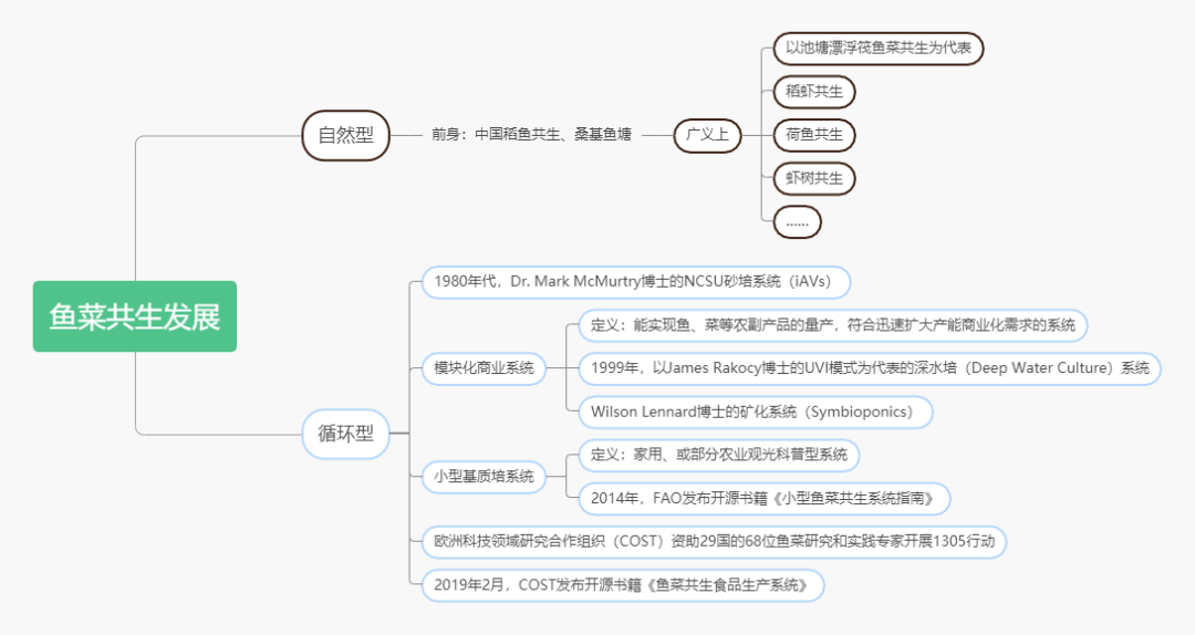 | 中國水產(chǎn)頻道報道, 這將是一篇干貨滿滿的“魚菜共生”專題資訊。筆者力求一文帶你讀懂“魚菜共生”的概念與原理,分析該類模式優(yōu)劣,探密其前世今生,一瞥它的知識寶庫及相關(guān)外延。 本文轉(zhuǎn)載自【智漁】編輯:于智海毒舌:賽可 01概念 “魚菜共生”是一類同時養(yǎng)殖魚類、種植植物的綜合種養(yǎng)系統(tǒng),這并非是一個全新的理念,我國自古有之。2005年浙江省青田縣龍現(xiàn)村的"稻田養(yǎng)魚"被列為世界首批農(nóng)業(yè)文化遺產(chǎn)保護項目,稻田養(yǎng)魚也被普遍認為是魚菜共生的前身。 圖源:微博 銅仁日報 圖源:頭條 農(nóng)村故事兒 圖源:微博 羊羊和饅頭星球的第一位居民 水稻田 在西方,“魚菜共生”(Aquaponics)一詞起源于20世紀70年代,由“水產(chǎn)養(yǎng)殖”(Aquaculture)和“水培”(Hydroponics)兩個詞組合而成。近來,也有人提出漁植共生、漁農(nóng)綜合種養(yǎng)等說法,以期改變大眾認知中的只能是“魚”和“蔬菜”共生的第一印象、拓寬其想象的空間。 圖5-7:美國的一個魚菜共生農(nóng)場(圖源:002mag.com) 02原理 一般而言,魚菜共生系統(tǒng)由水產(chǎn)養(yǎng)殖、植物生產(chǎn)兩部分子系統(tǒng)組合而成。在水產(chǎn)養(yǎng)殖子系統(tǒng)中,投喂后未被攝食的餌料、魚類排泄物在養(yǎng)殖水體中會轉(zhuǎn)化成有害的氨、亞硝酸鹽,而這種富氮尾水則是植物生產(chǎn)子系統(tǒng)主要的營養(yǎng)來源。系統(tǒng)中的微生物借助水循環(huán)將魚和植物聯(lián)系起來,將含氮類有害物質(zhì)轉(zhuǎn)化為可供植物吸收利用的硝酸鹽,水體得到凈化后又回到水產(chǎn)養(yǎng)殖池內(nèi),如此循環(huán)往復(fù),周而復(fù)始(如圖8-9)。 圖8:魚菜共生流程圖 圖9:魚菜共生原理圖 03優(yōu)劣分析 “魚菜共生”,通過科學(xué)的生態(tài)設(shè)計,使得魚、微生物、植物三者之間在水體循環(huán)中達到和諧共生的生態(tài)平衡,從而實現(xiàn)了養(yǎng)魚不(少)換水而無水質(zhì)憂患、種菜不施肥而茁壯成長的生態(tài)共生。 這種新型綜合種養(yǎng)模式不僅比土壤栽培時的病蟲害更少、節(jié)水節(jié)地、生態(tài)循環(huán),還能發(fā)展天臺農(nóng)園、科普觀光等項目,產(chǎn)出綠色健康的農(nóng)副產(chǎn)品。那么問題來了,除了用于養(yǎng)殖池塘凈水的漂浮筏魚菜共生系統(tǒng)之外,其他類型的系統(tǒng)為何遲遲沒有得到大規(guī)模推廣呢? 圖10:浙江杭州某公司的天臺農(nóng)園 筆者認為,魚菜共生的技術(shù)體系雖然已經(jīng)相對成熟,但還缺乏成熟的商業(yè)模式。生產(chǎn)地水土資源的稀缺性,地方的消費習慣,生產(chǎn)過程中的資源配置、市場開發(fā)、運營管理等方面都是制約推廣的關(guān)鍵因素。 至此,我們開篇提出的問題便有了答案。如能理性地進行推廣,魚菜共生則是有望解決傳統(tǒng)水產(chǎn)養(yǎng)殖與水培產(chǎn)業(yè)弊端的“朝陽產(chǎn)業(yè)”;但若忽視了因地制宜,那再好的模式也只能淪為難當大任的“未來科技”。 04前世今生 魚菜共生模式可分為自然型、循環(huán)型兩大類型(筆者只管大膽"胡說",各位看官可以辯證來看哦)。 圖11:魚菜共生的發(fā)展歷程 目前,國內(nèi)以種養(yǎng)一體的自然型系統(tǒng)更為多見,該類系統(tǒng)以池塘漂浮筏魚菜共生系統(tǒng)為代表,主要目的是為了凈化養(yǎng)殖池塘的水質(zhì)。 因此,在農(nóng)副產(chǎn)品的質(zhì)量、生產(chǎn)上存在著一些硬傷:首先,由于野外養(yǎng)殖生態(tài)環(huán)境復(fù)雜,在施加藥物時魚、菜無法隔離,系統(tǒng)產(chǎn)出的農(nóng)產(chǎn)品存在安全風險,消費者接受度較低;其次,自然型系統(tǒng)里只能種植空心菜、水芹等水生植物,一旦種植非水生植物,其根部就會因為缺氧而導(dǎo)致爛根,這大大限制了可種植植物的品類。 圖12:自然型——池塘中的空心菜生態(tài)浮床 圖源:重慶池塘漂浮筏魚菜共生系統(tǒng) 而發(fā)源于西方的循環(huán)型系統(tǒng),則以模塊化商業(yè)系統(tǒng)為代表,該類系統(tǒng)的水生動物養(yǎng)殖區(qū)、微生物硝化礦化區(qū)、植物種植區(qū)均被物理分割開來,整體設(shè)計可控性更高,可種植植物品類、產(chǎn)出農(nóng)產(chǎn)品的安全性都得以提升。 砂培是最早的閉鎖循環(huán)型系統(tǒng),后逐漸演化出基質(zhì)培、深水培、礦化系統(tǒng)等類型的系統(tǒng)。生產(chǎn)者可以根據(jù)所需供應(yīng)農(nóng)產(chǎn)品種類的不同,來導(dǎo)向性地選擇石英砂、鵝卵石、陶粒、火山石等基質(zhì)、或純水培方式。但此類型下衍生出的各類系統(tǒng)均需要電能驅(qū)動,或?qū)斑\行成本、系統(tǒng)的綜合管理要求較高;或因基礎(chǔ)研究斷層而在系統(tǒng)穩(wěn)定性上有待驗證(出于多方面的原因,NCSU砂培系統(tǒng)自Mark McMurtry博士(圖15)之后無人繼續(xù)研究)。 圖13-16:循環(huán)型-Mark McMurtry博士發(fā)明的砂培系統(tǒng)及上海某農(nóng)場的砂培種植[1] 圖17-19:循環(huán)型-美國深水培UVI系統(tǒng)[3] 圖片及數(shù)據(jù)源自UVI大學(xué)官網(wǎng) 圖20:循環(huán)型-礦化系統(tǒng) 將魚糞礦化后添加回系統(tǒng)完全利用[4] 圖21-23:循環(huán)型-重慶璧山某兩處陶;|(zhì)培系統(tǒng) 圖24:循環(huán)型-湖北鄂州某魚蝦菜共生系統(tǒng) 石斑魚、
