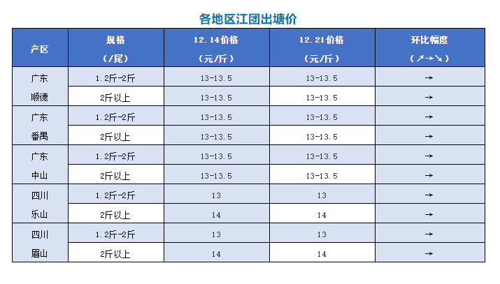 | 中國水產(chǎn)頻道原創(chuàng)報(bào)道, 文/圖 何氏水產(chǎn)、鱖鱸前沿 江團(tuán) 本周廣東江團(tuán)價(jià)格穩(wěn)定,1.2-2斤的規(guī)格都是13-13.5元/斤。目前廣東產(chǎn)區(qū)存塘量已經(jīng)不多,但銷量也不多,預(yù)計(jì)接下來價(jià)格會穩(wěn)定一段時(shí)間。 四川江團(tuán)本周價(jià)格保持穩(wěn)定,1.2-2斤報(bào)價(jià)13元/斤;2斤以上報(bào)價(jià)14元/斤。溫度下降,出魚量有所減少,市場供求達(dá)到平衡,預(yù)計(jì)價(jià)格會穩(wěn)定一段時(shí)間。 |
