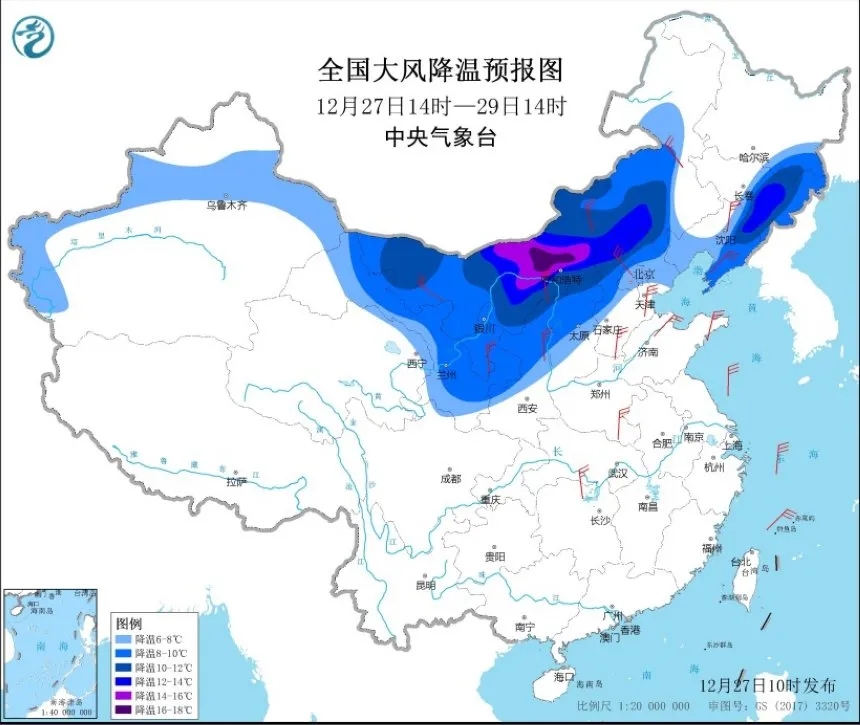 | 中國水產(chǎn)頻道報道, 中央氣象臺持續(xù)發(fā)布寒潮黃色預(yù)警: 27日起,強(qiáng)冷空氣將自西向東、自北向南影響我國中東部大部地區(qū),帶來大風(fēng)和強(qiáng)降溫天氣。預(yù)計28日至31日,中東部大部地區(qū)氣溫將下降10℃左右,西北地區(qū)東部、東北地區(qū)東南部、華北西部和北部、黃淮南部、江淮、江南、華南中北部等地降溫12~16℃,局地降溫幅度可達(dá)16℃以上,上述地區(qū)將有4~6級、陣風(fēng)7~9級偏北風(fēng),我國東部和南部海區(qū)有7~9級、陣風(fēng)10~11級偏北風(fēng)(圖1);降溫過后,最低氣溫0℃線將南壓至華南北部一帶,最低氣溫-10℃線在黃河下游到秦嶺一帶(圖2)。 圖1 2020年12月28日至31日過程降溫預(yù)報 圖2 2020年12月28日至31日過程最低氣溫預(yù)報 預(yù)計27日14時至29日14時,新疆西部和沿天山地區(qū)、甘肅大部、寧夏、陜西中北部、內(nèi)蒙古中西部、華北北部及東北地區(qū)東南部等地氣溫將下降6~10℃,其中,內(nèi)蒙古中西部將下降12~14℃,上述地區(qū)并伴有4~6級偏北風(fēng),陣風(fēng)可達(dá)7~8級(圖3);29日早晨,華北平原氣溫降至-4~-8℃,黃淮至關(guān)中平原氣溫降至0~-4℃(圖4)。 圖3 2020年12月27日14時至29日14時大風(fēng)降溫預(yù)報 圖4 2020年12月27日14時至29日14時最低氣溫預(yù)報 寒潮狂風(fēng)將席卷我國,最大11級!超一般臺風(fēng) 12月27日午后,從風(fēng)云4號高清可見光衛(wèi)星云圖上看,今天我國中東部雨雪的地方不是很多,不少地方是晴空區(qū),這是兩股冷空氣間歇中的平靜天氣,在這種平靜天氣里,我國南方不少地方的溫度持續(xù)回升,特別是華南沿海,廣東今天午后不少地方氣溫更是超過25度,開始有些熱。 但這種穩(wěn)定天氣其實是寒潮到來前最后的平靜,中央氣象臺12月27日早晨發(fā)布寒潮黃色預(yù)警,指出2020年最后的冷空氣即將發(fā)貨,未來幾天將給我國中東部地區(qū)帶來一次寒潮天氣過程。按照中央氣象臺的預(yù)測,12月28日起,這股寒潮將在我國中東部地區(qū)正式發(fā)威,給我國中東部地區(qū)帶來廣泛的6~10度降溫,不少地方的降溫幅度更是可達(dá)14度以上,在這股寒潮過后,我國將進(jìn)入到今年冬天以來的最冷時刻。 而這股寒潮的一個特點,是這股寒潮在南下我國中東部的時候是相當(dāng)迅速的,按照目前超級計算機(jī)的預(yù)測,僅僅在12月28日-12月30日期間,這股寒潮就要從塞北直接打到南海北部,迅速傾瀉而下的寒潮除了在我國中東部帶來猛烈降溫,也將帶來大范圍的強(qiáng)風(fēng)天氣。 中央氣象臺目前的預(yù)測認(rèn)為,寒潮南下后,中東部地區(qū)將普遍吹起4~6級、陣風(fēng)7~9級的偏北風(fēng),而東部和南部海區(qū)的風(fēng)勢還會更加強(qiáng)烈,渤海、黃海大部、東海大部、臺灣海峽、臺灣以東洋面、巴士海峽、北部灣、南海大部海域?qū)⒂?~8級、陣風(fēng)9~10級的北到東北風(fēng),其中黃海西南部海域、東海、臺灣海峽和臺灣以東洋面的部分海域風(fēng)力可達(dá)9級、陣風(fēng)10~11級,一些地方的風(fēng)勢甚至比弱臺風(fēng)還要厲害。因此這幾天,除了需要當(dāng)心寒潮帶來的低溫雨雪外,也要小心大風(fēng)可能帶來的高空墜物風(fēng)險,海上航行也要特別警惕。 今冬最強(qiáng)寒潮將南下!18省遭遇14-16℃猛烈降溫 12月27日上午7點,從整點氣溫圖上看,我國東北部地區(qū)的紫紅色中透出灰綠色,范圍比起之前還要更大了,這是我國東北部多地開始進(jìn)一步降溫的特征,這種特征說明了,在西伯利亞堆積的巨量嚴(yán)寒氣團(tuán)開始南下。 因此,今天上午中央氣象臺正式發(fā)布寒潮黃色預(yù)警,指出在2020年的最后幾天,大量冷空氣將傾瀉而下,將給我國中東部地區(qū)帶來一次寒潮天氣過程。按照中央氣象臺的預(yù)測,這股寒潮從今天起開始影響我國,并且在12月28日以后開始逐步擴(kuò)大其影響范圍。從12月28日-12月31日的大風(fēng)降溫預(yù)報圖上看,在這股寒潮影響下,我國中東部將普遍降溫,其中北方的內(nèi)蒙古、陜西、山西、河北、遼寧、吉林、河南多地降溫幅度可達(dá)14-16度,往南一些的安徽、江蘇、上海、浙江、湖北、湖南、江西、福建、貴州、廣西、廣東多地也將遭遇14-16度的猛烈降溫,總計約18個省級行政單位可能出現(xiàn)14度以上的降溫,局部降溫幅度更是將超過16度。 對于我國來說,這是繼雙十二寒潮后的又一股寒潮,但和雙十二寒潮相比,這股寒潮來勢更加兇猛,它的背后是東北亞地區(qū)強(qiáng)大的北極渦旋,北極渦旋此前已經(jīng)在西伯利亞不斷盤旋,其中蘊(yùn)含的嚴(yán)寒氣團(tuán)規(guī)模不斷擴(kuò)大、強(qiáng)度逐漸增強(qiáng),最終在今天起開始大舉南下,醞釀今冬以來最強(qiáng)的一次寒潮過程。 比如長三角地區(qū)的上海,官方預(yù)測顯示在寒潮大舉南下后的12月30日,上海最低氣溫可能跌到-5度,這是今年下半年以來的新低,此后的12月31日,上?赡苊媾R全天氣溫都在零度以下的“冰日”,同時,官方預(yù)測中也顯示,寒潮南下時,上?赡艹霈F(xiàn)雨夾雪。 冷到炸裂!廣西最低零下5℃,又要下雪 目前,一場即將速凍我國的跨年寒潮正在醞釀,蓄勢待發(fā)。預(yù)計12月28日至31日,這股寒潮將自北向南橫掃我國大部,帶來“速凍式”降溫和混合式雨雪,這將是今冬來影響我國的最強(qiáng)寒潮過程。屆時,25個省會級城