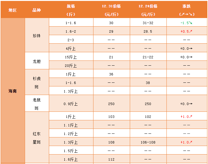 文/ 水產(chǎn)前沿 何鴻浩 行情簡析 中國水產(chǎn)頻道原創(chuàng)報(bào)道,廣東地區(qū):本周廣東地區(qū)珍珠價(jià)格下滑。目前,陽江、茂名1.2-2斤規(guī)格珍珠統(tǒng)貨達(dá)30-31元/斤。湛江地區(qū)1.0-1.6規(guī)格珍珠報(bào)價(jià)30-31元/斤;1.6-2規(guī)格珍珠報(bào)價(jià)為28-29元/斤。當(dāng)?shù)貥I(yè)者表示,前幾天珍珠已經(jīng)漲到了31.5-32元/斤,但近期魚貨較多,所以導(dǎo)致價(jià)格下行。 海南地區(qū):本周海南地區(qū)珍珠價(jià)格略有震蕩,1-1.6規(guī)格珍珠報(bào)價(jià)為30元/斤,下跌1.5元/斤;1.6-2規(guī)格珍珠報(bào)價(jià)為29元/斤,上漲0.5元/斤;15斤上龍膽報(bào)價(jià)21元/斤。而東星斑仍然情況好轉(zhuǎn),1斤上規(guī)格報(bào)價(jià)僅為103元/斤;1.3斤上規(guī)格為108元/斤,1.6斤上規(guī)格報(bào)價(jià)為112元/斤,均有小幅上漲。 福建地區(qū):本周福建地區(qū)各品種石斑魚下跌,青斑最新報(bào)價(jià)為29.5元/斤;珍珠斑規(guī)格魚報(bào)價(jià)為32元/斤,下跌2元/斤。當(dāng)?shù)亓魍ㄉ瘫硎,現(xiàn)在主要還是出魚扎堆,從而影響了市場價(jià)格。 廣西地區(qū):本周廣西石斑魚魚價(jià)小幅下跌,當(dāng)前1-1.6斤規(guī)格達(dá)31元/斤,跌幅為0.5元/斤;1.6-2斤規(guī)格達(dá)27-28元/斤,跌幅為0.5元/斤。當(dāng)?shù)仞B(yǎng)殖戶表示,目前價(jià)格雖有所下跌,但浮動不大,主要因?yàn)楹D稀⒄拷鲷~較多,影響本地價(jià)格,F(xiàn)在市場上還有一些存塘,預(yù)計(jì)元旦后大家才會開始有動靜。 臺灣地區(qū):本周臺灣地區(qū)珍珠價(jià)格整體平穩(wěn),1-1.6規(guī)格珍珠為34元/斤,與上周持平;1.6-2規(guī)格珍珠達(dá)31.5元/斤,下跌1元/斤。業(yè)者表示,目前價(jià)格還是穩(wěn)住了,總體基本沒有變化。 本周各地石斑魚報(bào)價(jià) 特別感謝:海南晨海水產(chǎn)有限公司、海南大順發(fā)水產(chǎn)有限公司、 中泰水產(chǎn)批發(fā)行、萊州明波水產(chǎn)有限公司、廣東上上生物科技有限公司、廣東大順發(fā)水產(chǎn)有限公司、福建藝祺水產(chǎn)養(yǎng)殖有限公司、逸源水產(chǎn)科技有限公司、涌益水產(chǎn)專業(yè)合作社對本文大力支持! |