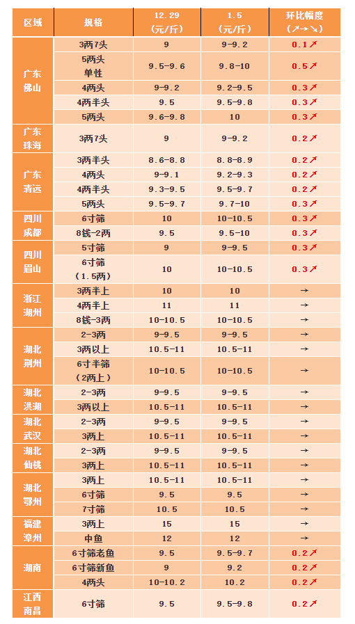 | 中國水產(chǎn)頻道原創(chuàng)報道, 市場不夠魚賣,魚販主動找魚抓,養(yǎng)殖戶惜售等價,黃顙魚未來可期! 文/水產(chǎn)前沿林貞武 一周要聞 要聞1:本周多地魚價上漲,最高漲0.5元/斤!冬季降溫,抓魚難度增加,養(yǎng)殖戶出魚積極性低,魚車走動逐步活躍,魚販到處找魚,大魚緊缺!四川魚價上漲0.3元/斤、湖南魚價上漲0.2元/斤,廣東上漲0.5元/斤,江西上漲0.2元/斤。 要聞2:本次元旦佳節(jié)的到來,市場消費量增加明顯,加上全國性大規(guī)模降溫影響了部分區(qū)域出魚節(jié)奏,整體上帶動了一波魚價上漲,鱖魚、加州鱸魚、生魚、黃顙魚、草魚等魚接連上漲!但是我們也要看到,本次漲價幅度并沒有很大,銷量大的持續(xù)時間并不是很長,不穩(wěn)定的疫情給市場帶來的影響不容小噓,目前大多數(shù)養(yǎng)殖戶把魚壓在春節(jié)前出,而且目前基本上所有的黃顙魚養(yǎng)殖區(qū)域的黃顙魚都閉口不進食,掉膘比較嚴重,體質(zhì)下降,部分區(qū)域水霉病等問題,有一定的風險,需合理出魚。 佛山市金浦飼料實業(yè)有限公司提供 一周行情分析 2018-2020年湖北武漢3兩上黃顙魚成品魚價格走勢 廣東佛山黃顙魚本周行情最高上漲0.5元/斤。元旦期間市場銷量增加,魚中表示目前塘頭大魚緊缺!目前養(yǎng)殖戶基本上塘租、飼料款之類的,該交的都差不多交完了,養(yǎng)殖戶不急用錢,很少主動出魚,反而是魚中到處找魚,大多數(shù)養(yǎng)殖戶都在等價中!目前3.5兩塘頭價為8.8-8.9元/斤,4兩魚頭的塘頭發(fā)價為9.2-9.5元/斤,4兩半頭的塘頭價為9.5-9.8元/斤,5兩頭的價格為10元/斤左右,單性5兩頭塘頭價10元/斤。目前市場一般以3.7-3.8兩頭以及4.5兩頭這兩個規(guī)格抓得比較多,大魚緊缺,再過一個月左右就要春節(jié)了,業(yè)界認為接下來魚價還要漲。 廣東清遠本周上漲0.3元/斤。情況和佛山類似,3兩半頭塘頭報價為8.6-8.8元/斤,主要看魚成數(shù),成數(shù)高的魚塘價格可以出高點點,4兩半頭為9.5-9.7元/斤,5兩頭為9.8-10元/斤。 四川本周魚價再漲0.3元/斤。川內(nèi)持續(xù)低溫,黃顙魚越來越不好拉,很多魚塘打不到魚,市場魚不夠賣!魚販抓魚積極,主動喊養(yǎng)殖戶賣魚,大部分養(yǎng)殖戶不愿意賣魚,第一是想繼續(xù)等漲價,第二是怕這種天氣拉上魚不好處理,只有小部分養(yǎng)戶愿意賣魚。目前市場走量為8萬斤/天左右,5寸篩賣9-9.5元/斤,6寸上10-10.5元/斤。當?shù)仄毡轲B(yǎng)殖戶認為隨著天氣越來越冷,再過一個月就春節(jié)了,魚價應(yīng)該還要升,漲價幅度在0.5-1元/斤之間。 浙江湖州本周價格微漲。北方市場出魚難,中部地區(qū)也不怎么出魚了,湖州市場魚車走動增加,多數(shù)養(yǎng)殖戶持魚觀望,有望繼續(xù)上漲。當前3兩多炮頭的魚塘頭發(fā)價為10元/斤左右,4兩頭塘頭價為10-10.5元/斤,4.5兩頭塘頭價為11元/斤出頭。 湖北本周價格維穩(wěn)。湖北降溫,打魚難度增加,而且本地存塘量不多,達到上市規(guī)格更少,加上養(yǎng)殖戶出魚積極性較低,觀望為主,出魚很少。白沙洲市場一天消化量穩(wěn)定在8萬斤左右,本地魚不足以供應(yīng)市場,市場7-8成的黃顙魚是外地魚,近期當?shù)夭蒴~非;鸨L頭快要蓋過特種魚了!目前6.5寸篩3.8-4兩頭塘頭價10.5元/斤,6寸篩9.5元/斤,7寸篩10.5-11元/斤。當前湖北市場銷售較為順暢,業(yè)界表示仍有繼續(xù)上漲的可能性! 湖南本周價格上漲0.2元/斤。當?shù)仞B(yǎng)殖戶出魚積極性較低,大多數(shù)養(yǎng)殖戶都把魚壓到年底賣,魚價穩(wěn)中上漲!目前新魚6寸篩塘頭價格為9.2-9.3元/斤,老魚6寸篩規(guī)格塘頭價為9.5-9.7元/斤,大魚10-10.2元/斤,養(yǎng)戶賣魚比較順利,目前湖南走貨量在超8萬斤/天,市場批發(fā)價為10.3元/斤。 福建漳州市場價格維持穩(wěn)定。二級魚12元/斤,3兩上一級魚塘頭價為15元/斤。 江西南昌本周價格微漲0.2元/斤。本地出魚不多,市場走量暢銷,目前6寸篩批發(fā)價為10-10.5元/斤,6寸篩塘頭價為9.5-9.8元/斤,業(yè)內(nèi)表示按照往年規(guī)律接下來預(yù)計會漲價。 1月5日各產(chǎn)區(qū)塘頭報價 備注:各地區(qū)塘頭發(fā)價可能存在誤差,僅供參考 |
