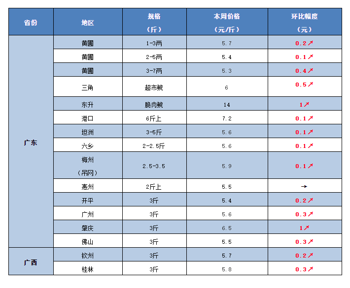 | 中國(guó)水產(chǎn)頻道原創(chuàng)報(bào)道, 鱖魚、南美白對(duì)蝦、斑節(jié)對(duì)蝦等多條魚蝦價(jià)格大幅下跌,但全國(guó)草魚全線飄紅漲漲漲! 文/水產(chǎn)前沿 鄭鵬飛 一周要聞 冷空氣再次發(fā)力,目前廣西桂林地區(qū)的氣溫也都已經(jīng)降至冰點(diǎn)(0℃)。近期,全國(guó)的魚價(jià)行情也是再次發(fā)力,各地草魚行情更是全線飄紅。 1.華南、華東地區(qū)草魚行情強(qiáng)勢(shì)上漲! 據(jù)了解,目前廣東中山1-3兩的草魚苗塘頭價(jià)已經(jīng)賣到5.7元/斤,繼續(xù)上漲0.2元/斤;6斤的草魚塘頭賣7.2元/斤;脆肉鯇漲幅更是達(dá)到1元/斤,11斤以上規(guī)格的最新報(bào)價(jià)14元/斤。有養(yǎng)殖戶反映,昨天肇慶地區(qū)3斤以上的草魚有人已經(jīng)賣到6.5元/斤,一周暴漲了1元/斤。目前,廣西武宣地區(qū)3斤草魚塘頭價(jià)也已經(jīng)賣到6元/斤,一周內(nèi)上漲0.5元/斤;桂林地區(qū)最新報(bào)價(jià)5.8元/斤,上漲0.3元/斤。本周福建、安徽、浙江多地草魚也出現(xiàn)大漲。目前,浙江衢州3斤的草魚塘頭價(jià)也已漲到6元/斤,上漲0.5元/斤;福建閩江、三明、南平等地草魚塘頭價(jià)基本漲到6.3-6.5元/斤,最高上漲0.5元/斤。 廣東肇慶3斤的草魚塘頭價(jià)賣到6.5元/斤,大漲1元/斤 2.華中草魚塘頭價(jià)全線突破6元大關(guān),江西漲幅最為明顯! 本周華中多地塘頭價(jià)再次出現(xiàn)大幅上漲,目前湖北洪湖草魚無(wú)論大小,塘頭價(jià)基本都已經(jīng)賣到6元/斤;隨州地區(qū)7-9斤的草魚最新塘頭價(jià)賣到7元/斤。 最近幾天,湖南永州地區(qū)3斤的草魚塘頭價(jià)也已經(jīng)賣到6元/斤,再次上漲0.5元/斤,湖南其它地區(qū)的草魚塘頭價(jià)也基本都已漲到6元/斤以上。目前,江西南昌地區(qū)3斤以下的草魚塘頭價(jià)可以賣到5.7元/斤,上漲0.5元/斤;樟樹地區(qū)2斤的草魚塘頭賣5.6元/斤,3斤以上的賣6元/斤,養(yǎng)殖戶表示目前仍保持上漲勢(shì)頭。 湖北洪湖草魚塘頭價(jià)賣到6元/斤,華中地區(qū)草魚基本全線突破6元大關(guān) 3.華北、東北地區(qū)草魚行情穩(wěn)步上漲! 據(jù)養(yǎng)殖戶介紹,目前河北地區(qū)3斤的草魚最新塘頭價(jià)賣到6元/斤,上漲0.2元/斤;遼寧地區(qū)塘頭價(jià)基本在6.2-6.3元/斤,上漲0.3元/斤。 一周行情 華南地區(qū) 本周冷空氣再次發(fā)力,而華南地區(qū)的魚價(jià)行情也是再次發(fā)力,價(jià)格行情幾乎全線飄紅。其中,草魚苗種上漲0.1-0.4元/斤;統(tǒng)鯇上漲0.1-0.5元/斤,局部地區(qū)漲幅達(dá)到1元/斤;脆肉鯇最大漲幅達(dá)到1元/斤,11斤以上的賣到14元/斤。 中山:本周中山地區(qū)的草魚行情出現(xiàn)整體上漲。目前,中山黃圃地區(qū)1-3兩的草魚苗塘頭價(jià)已經(jīng)賣到5.7元/斤,繼續(xù)上漲0.2元/斤。近期,大草魚和脆肉鯇的行情也是呈現(xiàn)明顯上升勢(shì)頭,目前6斤的草魚塘頭賣7.2元/斤,11斤以上的脆肉鯇最新報(bào)價(jià)14元/斤,漲幅達(dá)到1元/斤。 肇慶:最近肇慶的草魚塘頭價(jià)再次出現(xiàn)明顯上漲。從養(yǎng)殖戶了解到,昨天肇慶地區(qū)3斤以上的草魚有人已經(jīng)賣到6.5元/斤,最大漲幅達(dá)到1元/斤。 廣西:本周廣西桂林地區(qū)的氣溫也是已經(jīng)降到0℃,而最近廣西地區(qū)的草魚行情也是終于再次出現(xiàn)上漲。據(jù)了解,目前武宣地區(qū)3斤草魚塘頭價(jià)也已經(jīng)賣到6元/斤,一周內(nèi)上漲0.5元/斤;桂林地區(qū)塘頭也已經(jīng)賣到5.8元/斤,較上周上漲了0.3元/斤;貴港地區(qū)最新塘頭價(jià)賣5.7元/斤,較上周也有明顯上漲。 華中地區(qū) 本周華中地區(qū)的草魚行情整體上繼續(xù)呈現(xiàn)上升勢(shì)頭,多地塘頭價(jià)再次出現(xiàn)大幅上漲。 湖北:最近湖北的草魚行情整體上穩(wěn)中有升,塘頭價(jià)幾乎前線突破6元大關(guān)。據(jù)養(yǎng)殖戶介紹,目前洪湖地區(qū)草魚塘頭價(jià)基本都已經(jīng)賣到6元/斤,相比上周再次上漲0.4元/斤;隨州地區(qū)7-9斤的草魚最新塘頭價(jià)賣到7元/斤。不過,有養(yǎng)殖戶反映最近白沙洲市場(chǎng)草魚白天好賣,但是晚上賣不動(dòng),行情出現(xiàn)0.3-0.5元/斤的下滑。 湖南:本周湖南地區(qū)的草魚行情整體穩(wěn)中有升,2-3斤的草魚塘頭價(jià)基本都已經(jīng)漲到6元/斤。據(jù)養(yǎng)殖戶介紹,目前常德地區(qū)3斤的草魚塘頭賣6元/斤,基本維持上周水平;永州地區(qū)3斤的草魚塘頭價(jià)也已經(jīng)賣到6元/斤,再次上漲0.5元/斤。 江西:本周江西的草魚塘頭價(jià)再次出現(xiàn)大幅上漲。據(jù)養(yǎng)殖戶介紹,目前南昌地區(qū)3斤以下的草魚塘頭價(jià)可以賣到5.7元/斤,上漲0.5元/斤;樟樹地區(qū)草魚行情的漲幅在0.3元/斤左右,目前2斤的草魚賣5.6元/斤,3斤以上的賣6元/斤,養(yǎng)殖戶表示目前仍保持上漲勢(shì)頭。 華東地區(qū) 本周華東地區(qū)草魚塘頭價(jià)繼續(xù)強(qiáng)勢(shì)上漲,多地漲幅超過0.5元/斤,局部地區(qū)漲幅達(dá)到0.8元/斤。 福建:最近福建的草魚行情繼續(xù)保持強(qiáng)勢(shì)上漲勢(shì)頭。從養(yǎng)殖戶了解到,目前閩江地區(qū)3斤的草魚最新塘頭價(jià)賣6.5元/斤,較上周再次上漲0.3元/斤;三明地區(qū)3斤的草魚塘頭賣6.5元/斤,一周上漲了0.5元/斤。 浙江:據(jù)養(yǎng)殖戶介紹,目前衢州地區(qū)3斤的草魚塘頭價(jià)也已經(jīng)漲到6元/斤,相比之前上漲了0