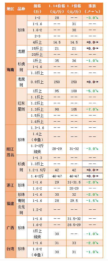 | 中國水產(chǎn)頻道原創(chuàng)報道, 本周各地石斑魚價格下滑,珍珠、青斑、東星等品種均受影響 文/ 水產(chǎn)前沿 何鴻浩 行情簡析 廣東地區(qū):本周廣東地區(qū)珍珠價格下滑。目前,陽江、茂名1.2-2斤規(guī)格珍珠統(tǒng)貨達(dá)28-29元/斤,下跌3元/斤。湛江地區(qū)1.0-1.6規(guī)格珍珠報價29元/斤,下跌幅度較大。當(dāng)?shù)貥I(yè)者表示,近期出魚量不大,部分地區(qū)不讓擺酒,魚價受到影響。 海南地區(qū):本周海南地區(qū)珍珠價格略有波動,1-2規(guī)格珍珠報價為28元/斤,下跌2-3元/斤;4斤上規(guī)格石斑魚14.5元/斤;15斤上龍膽報價21元/斤。東星斑同樣下跌,且本周下跌幅度較大,1斤上規(guī)格報價為95元/斤,下跌5元/斤;1.3斤上規(guī)格為98元/斤,下跌7元/斤。 福建地區(qū):本周福建地區(qū)各品種石斑魚下跌,跌幅在1-2元/斤左右,青斑最新報價28元/斤;珍珠斑規(guī)格魚報價30元/斤。當(dāng)?shù)亓魍ㄉ瘫硎,市場受到疫情防控影響,餐飲市場持?jǐn)慎態(tài)度,估計開春前價格都難有起色。 廣西地區(qū):本周廣西石斑魚魚價較為混亂,不同魚中價格有所差異,但整體行情趨于下行。目前1斤上統(tǒng)貨規(guī)格為30元/斤,下跌1-2元/斤。當(dāng)?shù)貥I(yè)者表示,近期寒潮天氣凍傷、凍死魚,養(yǎng)殖戶著急出魚,也因此導(dǎo)致價格波動。 臺灣地區(qū):本周臺灣地區(qū)珍珠價格持續(xù)下跌,1-1.6規(guī)格珍珠為31元/斤,下跌2元/斤;1.6-2規(guī)格珍珠達(dá)30元/斤,下跌1元/斤。業(yè)者表示,因疫情影響,部分地區(qū)不提倡聚餐,導(dǎo)致此輪價格下跌。 本周各地石斑魚報價 特別感謝:海南晨海水產(chǎn)有限公司、海南大順發(fā)水產(chǎn)有限公司、 中泰水產(chǎn)批發(fā)行、萊州明波水產(chǎn)有限公司、廣東上上生物科技有限公司、廣東大順發(fā)水產(chǎn)有限公司、福建藝祺水產(chǎn)養(yǎng)殖有限公司、逸源水產(chǎn)科技有限公司、涌益水產(chǎn)專業(yè)合作社對本文大力支持! |