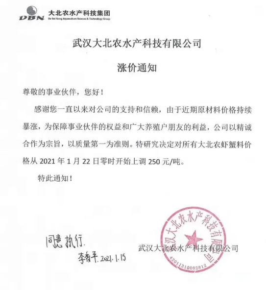 珠三角漲價(jià)潮正式來襲 中國水產(chǎn)頻道原創(chuàng)報(bào)道,隨著華中、華東、西南、海南等地飼料價(jià)格不斷上漲,華南水產(chǎn)養(yǎng)殖重地珠三角也宣布飼料漲價(jià)。1月22日,佛山市順德區(qū)飼料商會(huì)發(fā)布調(diào)價(jià)通知,建議各飼料企業(yè)于2021年1月22日起,對(duì)魚料漲價(jià)4元/包。至此,珠三角飼料漲價(jià)潮或正式來襲。 佛山市順德區(qū)飼料商會(huì)調(diào)價(jià)通知 條件更嚴(yán)苛,不給予過渡料、不可以打預(yù)付款 近日,豆粕價(jià)格出現(xiàn)小幅回落,主流市場下降了100元/噸,從飼料行業(yè)信息網(wǎng)統(tǒng)計(jì)表顯示可以看出,1月22日主流市場豆粕的價(jià)格最高穩(wěn)定在4050元/噸,較1月20日的最高價(jià)4150元/噸下跌了100元。但下降的100元較之前一個(gè)月內(nèi)漲超1000元/噸相比,可謂“杯水車薪”,小幅下滑或遠(yuǎn)不足以緩解飼料廠的壓力,再加上其他原料價(jià)格有增無減,目前飼料市場仍持續(xù)漲價(jià)態(tài)勢。 不但飼料持續(xù)漲價(jià),并且部分飼料廠出臺(tái)的條件更加嚴(yán)苛,通知明確表示本論漲價(jià)不給予過渡料、不可以打預(yù)付款!已知目前水產(chǎn)料企還未實(shí)行這一政策,但未來會(huì)不會(huì)呢? 主流市場豆粕價(jià)格最高下跌100元/噸 海大持續(xù)漲價(jià),最高漲400元/噸 回到大家關(guān)注的水產(chǎn)料,1月20日、1月21日、1月24日,海大持續(xù)擴(kuò)大漲價(jià)范圍,華東地區(qū)蝦蟹料全線漲價(jià),包括南通海大、泰州海大、常州海大、淮安海龍、安徽海大和和縣海大,漲價(jià)品種主要是螃蟹和小龍蝦料。其中泰州海大螃蟹功能料(蟹康泰系列及紅膏糧系列)價(jià)格上漲8元/包,一包為40斤,則一噸漲價(jià)400元,漲價(jià)時(shí)間為1月24日零時(shí)起。 泰州海大生物飼料有限公司蝦蟹料調(diào)價(jià)通知 南通海大生物科技有限公司漲價(jià)通知 常州海大生物飼料有限公司漲價(jià)通知 安徽海大飼料有限公司調(diào)價(jià)通知 淮安海龍飼料有限公司漲價(jià)通知 和縣海大生物科技有限公司漲價(jià)通知 西南地區(qū)魚料最高漲300元/噸 另外,早在幾天前,西南地區(qū)也有數(shù)個(gè)飼料廠上調(diào)水產(chǎn)料,分別:金錢飼料(昆明)有限公司、云南廣聯(lián)畜禽有限公司、四川優(yōu)特普生物科技有限公司,最高漲價(jià)幅度為300元/噸。具體漲價(jià)通知如下: 金錢飼料(昆明)有限公司調(diào)價(jià)通知 云南廣聯(lián)畜禽有限公司漲價(jià)通知 四川優(yōu)特普生物科技有限公司漲價(jià)通知 回顧:更多料企發(fā)布水產(chǎn)料漲價(jià)通知 浙江海大飼料有限公司龍蟹料產(chǎn)品漲價(jià)通知 泰州澳華農(nóng)牧科技有限公司調(diào)價(jià)通知 泰州新希望特水料調(diào)價(jià)通知 廈門通威飼料有限公司漲價(jià)通知 揚(yáng)州通威飼料有限公司漲價(jià)通知 無錫通威生物有限公司特種料分公司漲價(jià)通知 南通巴大飼料有限公司漲價(jià)通知 九江大北農(nóng)水產(chǎn)科技有限公司漲價(jià)通知 武漢大北農(nóng)水產(chǎn)科技有限公司漲價(jià)通知 湖南神爽水產(chǎn)科技有限漲價(jià)通知 荊州格力特生物科技有限公司漲價(jià)通知 荊州展翔飼料有限公司 湖南粵海飼料有限公司價(jià)格調(diào)整通知 武漢澳華農(nóng)牧科技有限公司調(diào)價(jià)通知 宜昌傲農(nóng)飼料有限公司調(diào)價(jià)通知 襄陽新希望六和飼料有限公司漲價(jià)通知 天門海大飼料有限公司調(diào)價(jià)通知 武漢正大水產(chǎn)有限公司調(diào)價(jià)通知 荊州新希望飼料有限公司調(diào)價(jià)通知 天門通威生物科技有限公司漲價(jià)通知書 中山統(tǒng)一企業(yè)有限公司產(chǎn)品調(diào)價(jià)通知 海南翔泰漁業(yè)股份有限公司調(diào)價(jià)通知 云南安佑飼料科技有限公司魚料漲價(jià)通知 海南禾杰飼料科技有限公司升價(jià)通知 海南省飼料獸藥行業(yè)協(xié)會(huì)關(guān)于調(diào)整飼料價(jià)格通知 |