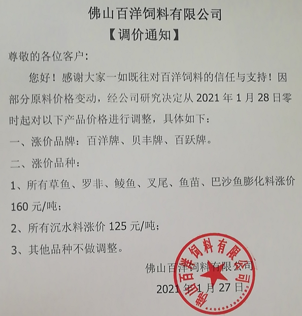 | 中國水產(chǎn)頻道報道, 果不其然,昨天廣西粵海、海南粵海、湛江海榮、惠州澳華、廣西百洋、廣西百躍、順德豐華等飼料廠家發(fā)布漲價消息后,今日,更多飼料企業(yè)加入漲價行列,包括珠海海龍、高要海大、福建海大、福建粵海、福建恒興、福建澳華、福建大北農(nóng)、漳州傲農(nóng)、佛山百洋等,最高漲價300元/噸。 福建海大飼料有限公司漲價通知 福建粵海飼料有限公司調(diào)價通知 福建恒興飼料有限公司漲價通知 福建澳華農(nóng)牧科技有限公司調(diào)價通知 福建大北農(nóng)水產(chǎn)科技有限公司漲價通知 漳州傲農(nóng)牧業(yè)科技有限公司漲價通知 佛山百洋飼料有限公司調(diào)價通知 |