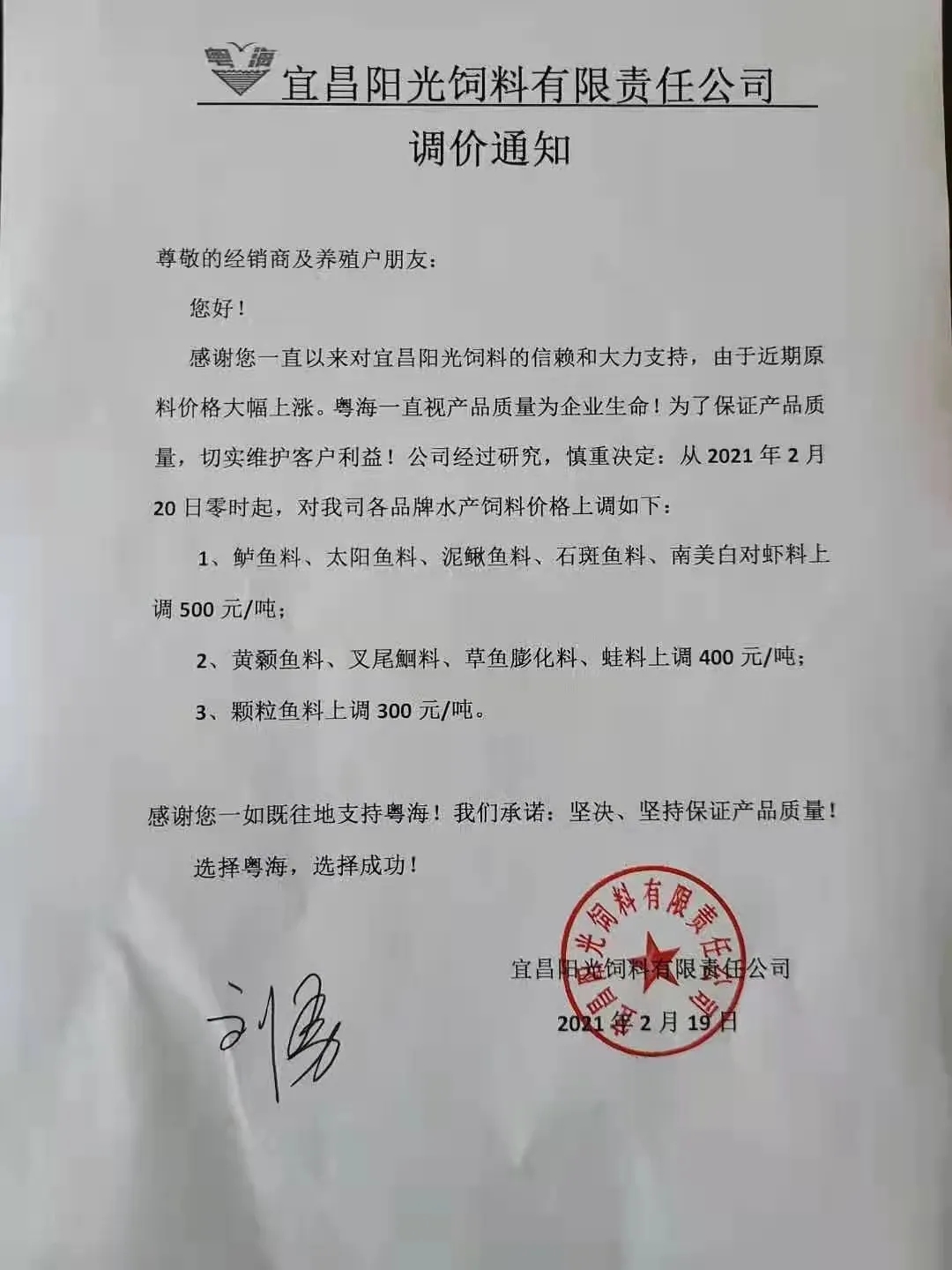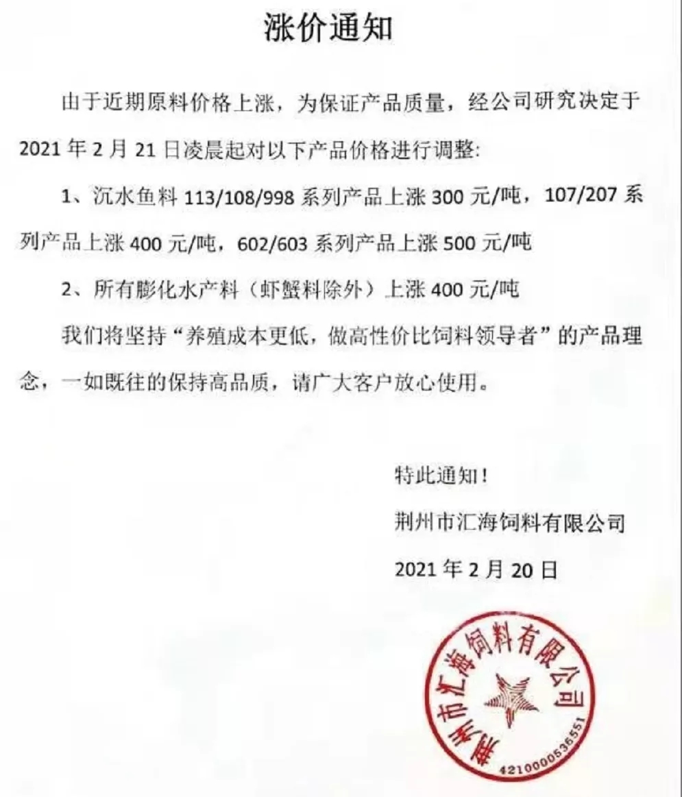 | 中國水產(chǎn)頻道報道, 水產(chǎn)料真是漲瘋了!一大波料企上調(diào)料價,最高漲1500元/噸,海大卻降300元/噸 文/ 中國水產(chǎn)頻道 今天(2月23日),又一大波水產(chǎn)飼料企業(yè)宣布漲價! 前天,我們報道了牛年水產(chǎn)料第一漲,漲價集團(tuán)巨頭有海大、澳華、粵海等,最高漲500元/噸,引發(fā)了行業(yè)巨大關(guān)注。昨天(2月23日),我們又收到不少大集團(tuán)企業(yè)漲價的消息,有通威、大北農(nóng)、粵海、恒興、禾豐和匯海集團(tuán)料企。漲價的區(qū)域仍是華中地區(qū),漲價的品種有常規(guī)魚料、特種魚料、蝦蟹料,還有石斑魚料、南美白對蝦料......今天的這一輪漲價可謂“猛烈”,常規(guī)魚料一次就暴漲900元/噸、特種魚料暴漲竟達(dá)1500元/噸,真的很瘋狂! 其中天門通威漲價通知表示,由于市場原料價格大幅上漲,導(dǎo)致飼料成本大幅上漲,公司為保證產(chǎn)品質(zhì)量始終如一,經(jīng)公司研究決定,自2021年2月23日零時起,常規(guī)魚料漲價幅度為300-900元/噸、特種魚料漲價幅度為500-1500元/噸、蝦蟹料漲價400元/噸。而在1月份,天門通威生物科技有限公司已2次上漲蝦蟹料的價格,一次在1月1日,漲價250元/噸、1月27日漲價300元/噸,這樣累計三次蝦蟹料漲價總計達(dá)到了950元/噸! 其余的料企,如大北農(nóng)、粵海、匯海等蝦蟹料均為第二次漲價,2次合計漲幅一般都在550-600元/噸。 除了今天漲價的料企外,漢川恒興也加持發(fā)布了明天(2月24日)漲價的消息,淡水魚料、特種魚料、蛙料全部漲400元/噸。 另據(jù)荊州禾豐飼料負(fù)責(zé)人則中國水產(chǎn)頻道表示,禾豐飼料在牛年前已經(jīng)通知漲價,根據(jù)最新原料行情走勢,很可能在短期內(nèi)要對魚顆粒料膨化料作繼續(xù)跟漲100-200元/噸的意向。 令行人意外和尋味的是,就在眾多料企強勢上調(diào)料價之際,荊州海大卻宣傳在今天(2月23日)對所有的蝦蟹料產(chǎn)品降價消息,每噸下調(diào)300元/噸。 但其實說意外也不是太意外,因為下調(diào)飼料價格的不只是荊州海大一家,還有東北沈陽揚翔飼料廠已在前幾天發(fā)布通知:2月18日對豬飼料價格下調(diào)60-150元/噸。據(jù)飼料行業(yè)信息網(wǎng)信息,目前原料的玉米仍表現(xiàn)強勢和漲價,今天最高再100元/噸,但豆粕大漲大跌都很難,窄幅波動是主旋律。 附:企業(yè)最新漲價通知 天門通威生物科技有限公司漲價通知 揚州通威飼料有限公司漲價通知 湖南粵海飼料有限公司調(diào)價通知 天門粵海飼料有限公司調(diào)價通知 宜昌陽光飼料有限責(zé)任公司調(diào)價通知 武漢大北農(nóng)水產(chǎn)科技有限公司 漢川恒興飼料有限公司調(diào)價通知 荊州禾豐農(nóng)業(yè)科技有限公司調(diào)價通知 湖北匯海農(nóng)牧科技有限公司漲價通知 荊州市匯海飼料有限公司漲價通知 兩料企降價通知: 荊州海大飼料有限公司降價通知 沈陽揚翔飼料有限公司調(diào)價通知 附:牛年企業(yè)漲價回顧 天門海大飼料有限公司調(diào)價通知 湖南洞庭海大飼料有限公司漲價通知 武漢澳華農(nóng)牧科技有限公司調(diào)價通知 益陽澳華農(nóng)牧科技有限公司調(diào)價通知 江門粵海飼料有限公司調(diào)價通知 海大在降價,未來水產(chǎn)料市場的主流態(tài)勢是降還是漲? 據(jù)業(yè)內(nèi)人士表示,現(xiàn)玉米仍然持續(xù)高位局部上漲,豆粕短期沒有大幅調(diào)整 ,但是目前判斷飼料價格反轉(zhuǎn)為下調(diào),為時過早。但水產(chǎn)料上,荊州海大邁出了降價第一步,你認(rèn)為未來水產(chǎn)料市場的主流態(tài)勢是降還是漲呢?歡迎大家投票或在留言區(qū)發(fā)表評論意見。(本文轉(zhuǎn)自【中國水產(chǎn)頻道】。如有版權(quán)問題,敬請聯(lián)系wx@fishfirst.cn。) |