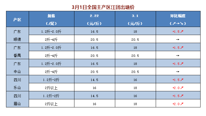 | 中國水產(chǎn)頻道綜合報道, 全國魚蝦價格火爆大漲,3月起廣東、福建、武漢、浙江,多地水域將實施禁漁為期4個月,或將帶動價格行情持續(xù)上漲 牛年春節(jié)過后,水產(chǎn)市場難降溫,并且不斷傳來好消息,多個品種如魚蝦蛙價格持續(xù)暴漲或高位運行。3月份起,我國多個省區(qū)的多條河流水域實施禁漁制度,為期足足4個月,或加持刺激本來就利好魚蝦行情!芭D昱J小泵惶搨,養(yǎng)殖戶生產(chǎn)投苗信心十足,熱情高漲...... 多年難遇強勢好行情,魚蝦價全線大漲 缺蛙!牛蛙大漲“破10”,后市還要漲 今日,水產(chǎn)前沿收到牛蛙主流廠家的收購價飆漲至10元/斤,較周日時的9元/斤再漲1元/斤,大中蛙一樣價均為10元一斤。據(jù)悉,目前市場缺蛙,廣東澄海商品牛蛙所剩不多,其他地區(qū)牛蛙也大都不夠規(guī)格就上市,未來市場供不應求的態(tài)勢持續(xù),蛙價預計還會繼續(xù)上漲。 廣東鱖魚最高暴漲4.5元/斤 周一(即3月1日)廣東鱖魚塘頭報價1-2成小魚沒有中桂開塘30-31元/斤,比上周漲了4元/斤;1-2成中桂開塘價31-32元/斤,比上周漲了2元/斤;三成以上中桂33-34元/斤,比上周漲了4.5元/斤。隨著鱖魚存塘量進一步的減少,特別是大規(guī)格魚占比更少,再加上近期外省魚也比較少,養(yǎng)戶惜售價格飆升。后市價格很難預測,希望養(yǎng)殖戶把握好時機出魚。 廣西產(chǎn)區(qū)標桂比上周漲了1元/斤,價格33元/斤;湖北產(chǎn)區(qū)標桂價格比上周也上漲了1元/斤,報價34元/斤;江蘇地區(qū)標桂價格本周保持穩(wěn)定,報價32元/斤。 供貨緊張,江團全線飄紅,最高漲2元/斤,后市還有上漲空間 本周廣東江團價格1.2-2斤報價18元/斤,比上周上漲了1.5元/斤,2-4斤的報價20.5元/斤,跟上周一樣。近期江團供貨還是比較緊張,特別是1.2-2.0斤規(guī)格的魚。部分養(yǎng)戶看好后市價格,出魚積極性較低。預測價格或將會有小幅上漲的空間。 四川江團本周1.2-2斤報價16元/斤,比上周上漲了1.5元/斤;2斤以上報價18元/斤,比上周上漲了2元/斤。當?shù)厍闆r跟廣東差不多,魚也是比較緊張,養(yǎng)戶出魚積極性較低。 鯽魚也火了,最高11元/斤!同比、環(huán)比均大漲 本周全國鯽魚塘口均價8.46元/斤,同比上漲11.61%,環(huán)比上漲8.74%。 華東地區(qū):江蘇大豐、鹽城地區(qū)鯽魚價格較亂,近期飼料價格上漲,養(yǎng)殖戶惜售心理嚴重,大豐地區(qū)1.1斤左右銀鯽價格達11元/斤,黃鯽價格達7.5-8元/斤。 華西地區(qū):四川鯽魚受外省魚沖擊,5兩鯽魚價格較春節(jié)期間有回落,5兩價格達8.5元/斤左右。因苗種緊缺,價格達9元/斤。 漲漲漲!鯉魚最高7.4元/斤! 本周全國鯉魚塘口均價6.22元/斤,同比上漲35.22%,環(huán)比上漲18.25%。 華北地區(qū):河南洛陽、鄭州地區(qū)鯉魚春節(jié)期間流通較大,目前存塘僅1成,價格高達7.2-7.4元/斤。吉林地區(qū)已呈現(xiàn)缺魚情況,2.5斤鯉魚價格5.5元/斤。遼寧地區(qū)存塘僅3成,春節(jié)期間價格高達6.5元/斤,目前因消費下降,價格回落致5.7元/斤。河北地區(qū)養(yǎng)殖戶陸續(xù)清塘,價格達5.5-6元/斤。 華西地區(qū):寧夏地區(qū)因北方鯉魚價格上漲,對當?shù)貨_擊減少,帶動本地鯉魚價格上漲,但流通依舊較少,存塘達6-7成。 一天一個價!生魚市場發(fā)生搶魚大戰(zhàn),發(fā)車價重回10元大關 近日生魚市場發(fā)生搶魚大戰(zhàn),越大越搶,舊魚2斤上9成多統(tǒng)貨9.3元/斤,昨天舊魚2斤上大魚發(fā)車價10元/斤了!行業(yè)預計今年的生魚行情火熱如同2017年,預計在4月份棚魚2斤上大魚塘頭價達到14.9元/斤,2斤下中魚價格塘頭價達到9元/斤。水漲船高,商品魚價格上漲刺激養(yǎng)殖戶熱情,導致目前魚苗價格飆高,黑芝麻最高漲到500元/萬尾。 羅氏沼蝦缺蝦,塘頭價賣到64元/斤 近來缺貨成水產(chǎn)收購常態(tài),不但缺魚,也缺蝦。羅氏沼蝦市場因缺蝦,價格高位上漲,本周一時塘頭價最高價達到64元/斤,比上周同期上漲4元/斤。珠三角業(yè)者表示,近期市場較為缺蝦,就算是小規(guī)格蝦也是寶,價格上漲快速,預計該情況會延續(xù)到清明。 加州鱸、黃顙魚全部上漲 除了上述品種外,還有很多條價格也大幅漲價,如加州鱸最高賣到14.5元/斤;全國多地黃顙魚因存塘少,養(yǎng)殖戶惜售而漲價,多種規(guī)格最高漲0.5元/斤,最高價賣到15元/斤。 3月1日起,廣東、福建、湖北、浙江多省水域禁漁 廣東 珠海 據(jù)珠海市農(nóng)業(yè)農(nóng)村局我市將于2021年3月1日0時至2021年6月30日24時在全市內河水域實行珠江禁漁期制度。 禁漁水域范圍覆蓋全市內河水域,包括磨刀門口,以珠海大橋和泥灣門大橋為界向珠江一側水域;雞啼門口,以雞啼門大橋為界向珠江一側水域;虎跳門口,以南門大橋為界向珠江一側水域;前山河,以昌盛橋為界向前山河一側水域。 在規(guī)定的禁漁區(qū)和禁漁期內,除休閑漁業(yè)、娛樂性垂釣外,禁止所有捕撈作業(yè)。 如違反規(guī)定的,該局將依據(jù)《中華人民共和國漁業(yè)法》等有關法律法規(guī)予以處罰,情節(jié)嚴重的,將移送司法機關處理。 佛山 3月1日起,佛山進入禁漁期,一直持續(xù)到6月30日24時。 為了更好地養(yǎng)護水生生物資源,保護水域生態(tài)環(huán)境,推動漁業(yè)綠色發(fā)展,根據(jù)《中華人民共和國漁業(yè)法》和農(nóng)業(yè)農(nóng)村部《關于發(fā)布珠江、閩江及海南省內陸水域禁漁期制度的通告》(農(nóng)