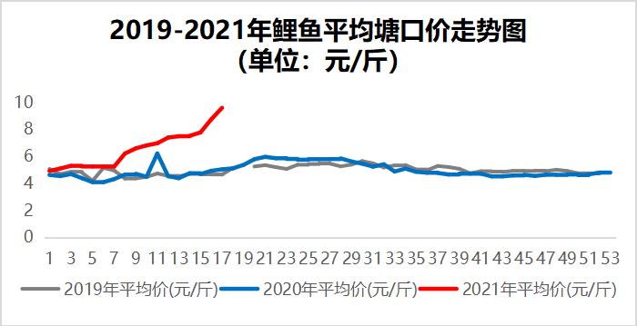 | 中國水產(chǎn)頻道報道, 鯉魚 近三年全國鯉魚塘口價格走勢 原因分析 本周全國鯉魚均價為9.6元/斤,同比增長90.1%,環(huán)比增長9.7%。 華西寧夏地區(qū),目前存塘2-3成,本地需求量不大,主要運往拉薩、南州等地,但近期有東北、河南地區(qū)涌入市場拉魚,本周較上周對比價格上漲1.8元/斤,高達10元/斤;河南地區(qū)均價從上周8.7元/斤,本周均價已突破10元/斤。河南地區(qū)已無魚可售,少量1.2斤規(guī)格已在出售,價格在10.5~10.8元/斤,因水溫交替不穩(wěn)定,養(yǎng)殖戶不敢大量投料,易引發(fā)魚病。(本文轉(zhuǎn)自【通威農(nóng)牧】。如有版權(quán)問題,敬請聯(lián)系wx@fishfirst.cn。) |