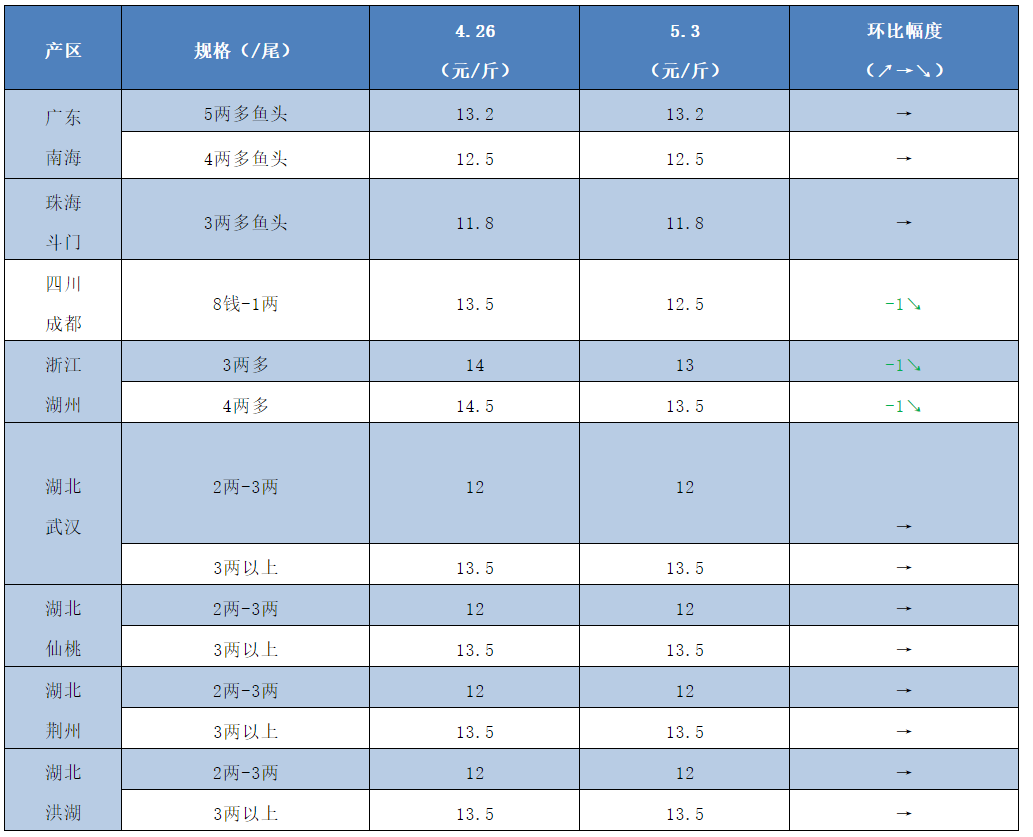 文/圖 何氏水產(chǎn)、水產(chǎn)前沿 李靜 中國水產(chǎn)頻道原創(chuàng)報道,1、本周廣東黃顙魚5兩多魚頭報價13.2元/斤,跟上周一樣;4兩多魚頭報價12.5元/斤,跟上周一樣;3兩多魚頭11.8元/斤,也保持穩(wěn)定。銷量比上周有所減少,價格持續(xù)保持穩(wěn)定。 2、浙江湖州黃顙魚本周價格,3兩多魚頭13元/斤,比上周下跌1元/斤;4兩多魚頭報價13.5元/斤,也比上周下跌1元/斤;湖北黃顙魚2-3兩多魚頭價格在12元/斤,跟上周一樣;3兩以上報價13.5元/斤,保持不變。 各地區(qū)黃顙魚出塘價 備注:黃顙魚因魚頭大小與3兩上大骨所占的具體比例導(dǎo)致成交價格會有一定幅度的波動 |