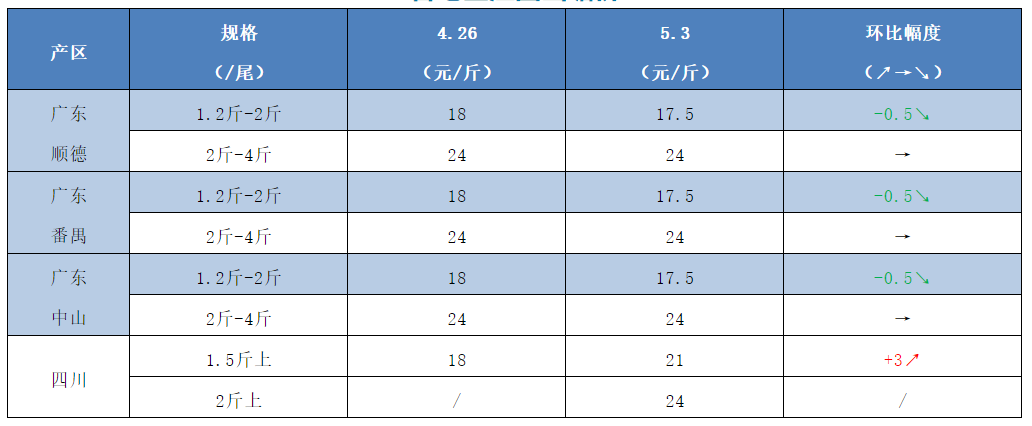文/圖 何氏水產(chǎn)、水產(chǎn)前沿 李靜 中國(guó)水產(chǎn)頻道原創(chuàng)報(bào)道,1、本周廣東江團(tuán)價(jià)格,1.2-2斤報(bào)價(jià)17.5元/斤,比上周下跌0.5元/斤;2-4斤的報(bào)價(jià)24元/斤,保持穩(wěn)定。近段時(shí)間,塘頭多魚(yú)出來(lái)了,特別是1-2斤規(guī)格的魚(yú)。大規(guī)格魚(yú)也相較之前沒(méi)有那么緊張了,魚(yú)價(jià)暫時(shí)持穩(wěn)。 2、四川江團(tuán)1.5斤以上報(bào)價(jià)21元/斤,上漲3元/斤,2.0斤以上價(jià)格24元/斤,當(dāng)?shù)佤~(yú)規(guī)格還不是很大,出魚(yú)量也不多。 各地區(qū)江團(tuán)出塘價(jià) 注:上述價(jià)格及行情分析僅供參考,市場(chǎng)有風(fēng)險(xiǎn),入市需謹(jǐn)慎。 |